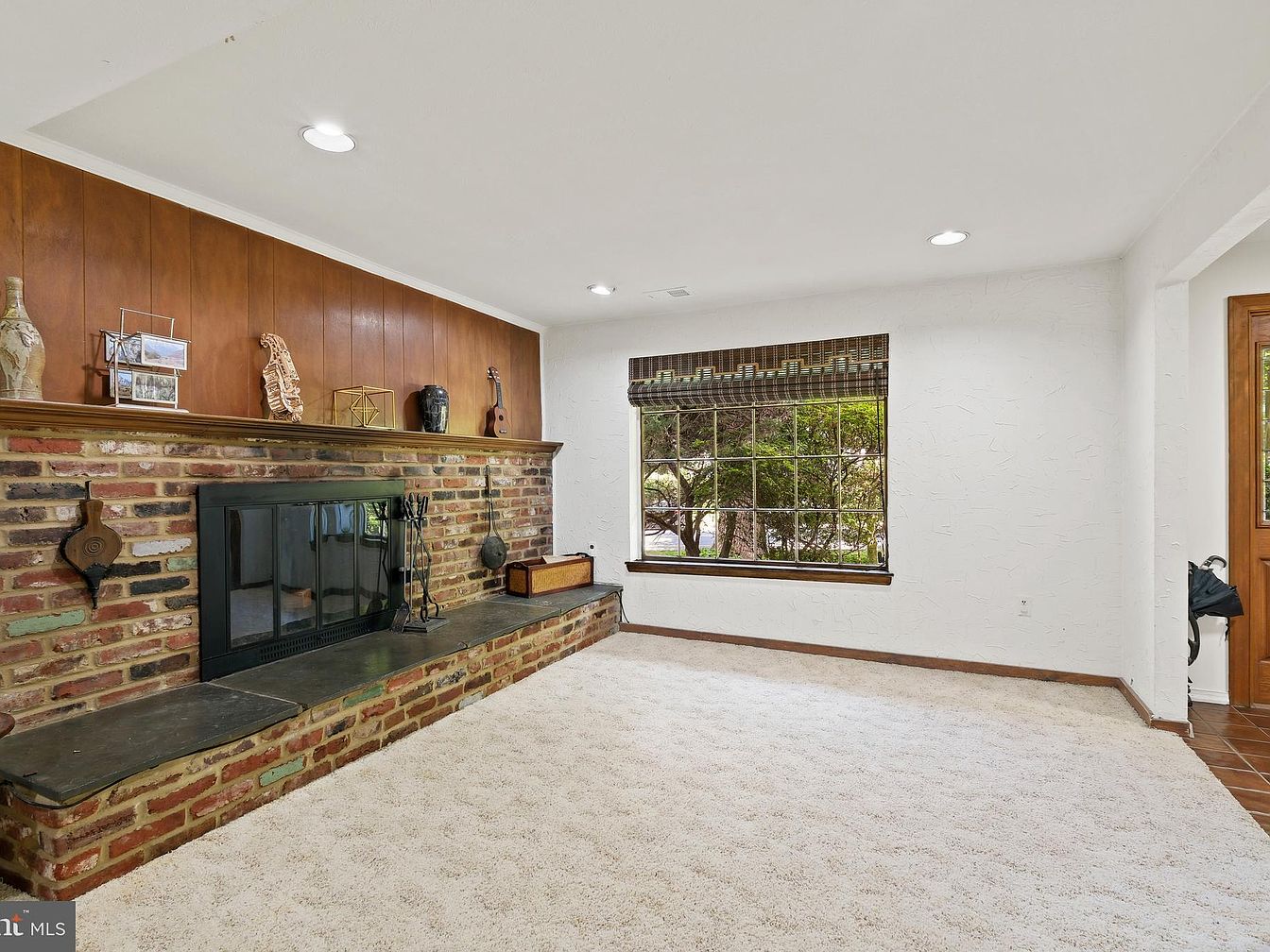 This inviting living space centers around a large brick fireplace with a black metal frame and hearth extending across the wall, perfect for cozy gatherings. Above, warm wood paneling adds contrast against the textured white walls and ceiling, accented by recessed lighting that brightens the room evenly. The window opposite the fireplace features a natural woven blind, allowing views of lush greenery outside while welcoming soft natural light. The plush cream-colored carpet grounds the area, creating a warm and comfortable atmosphere, seamlessly transitioning to a tiled entryway near the wooden door, blending rustic charm with simplicity.