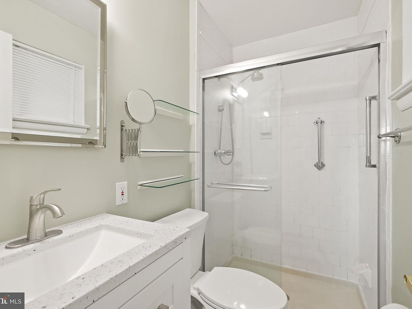 This bathroom features a clean, minimalist design with a neutral color palette dominated by soft white and light beige tones. A sleek, white vanity with a speckled quartz countertop includes a brushed nickel faucet, complementing the metal finishes throughout. Above the vanity, a large rectangular mirror brightens the space, while a smaller, adjustable magnifying mirror is mounted nearby for convenience. Clear glass shelves provide open storage without cluttering the room. The walk-in shower is enclosed with transparent sliding doors and lined with simple white tiles, accented by silver hardware including sturdy grab bars, balancing safety and style.