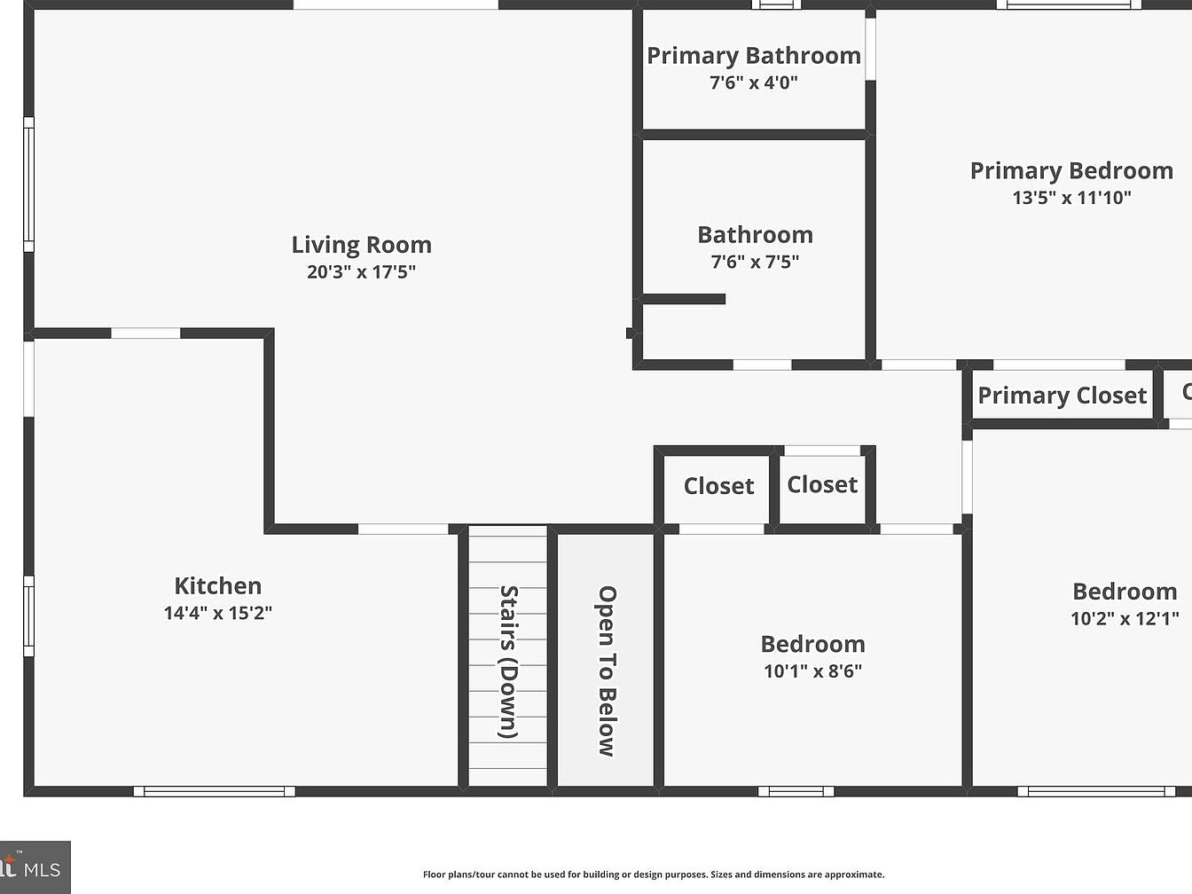This layout reveals a spacious living room at its center, measuring over 20 feet by 17.5 feet, highlighting its use as a gathering area. Adjoining the living room to one side is a large kitchen, about 14.5 by 15 feet, ideal for both cooking and entertaining. Bedrooms and bathrooms are clustered on the right side, offering privacy, including a primary bedroom with attached bathroom and closet. Two smaller bedrooms share a nearby bathroom. The stairway and open-to-below space suggest a multi-level home with circulation designed for both openness and functional separation of living and private zones.
