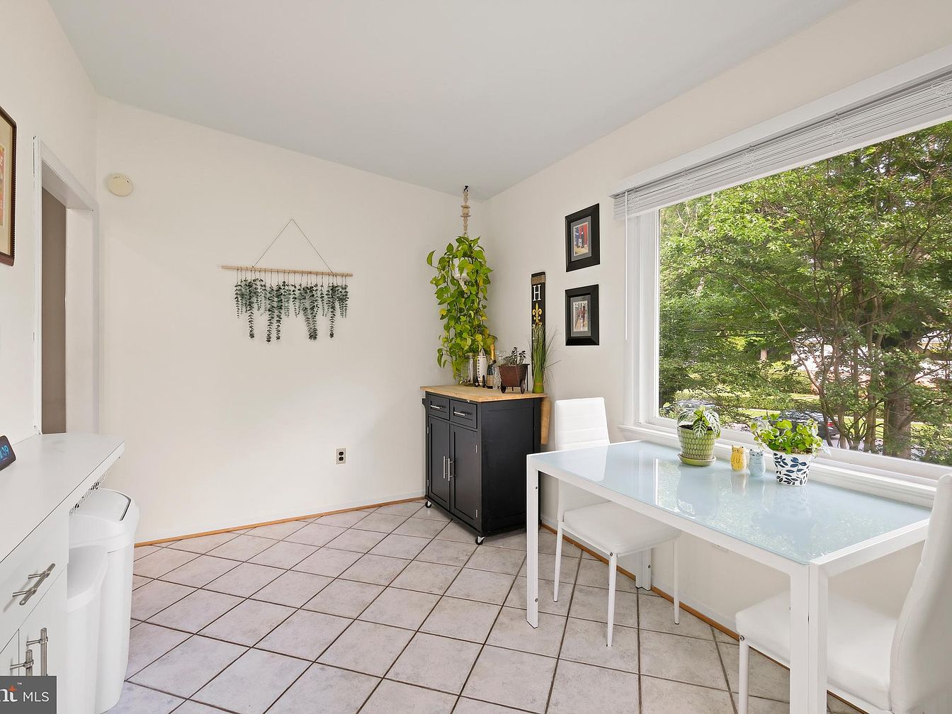 This inviting breakfast nook features a clean, bright design with a large window that brings in ample natural light and offers a refreshing view of lush green trees outside. The space is outfitted with a sleek white table and matching chairs, creating a minimalist yet cozy dining area. The floor is covered with neutral-toned ceramic tiles laid in a grid pattern. A black wooden cabinet with a natural wood top sits in the corner, adorned with a vibrant hanging plant and small decor items, adding warmth and a touch of nature. The walls are painted soft white, decorated with a simple hanging greenery and framed artwork, emphasizing a calm and airy atmosphere perfect for casual meals or morning coffee.