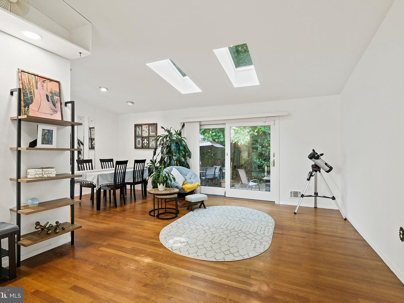Natural light fills this open-concept living and dining space through two skylights and large sliding glass doors, creating an airy and inviting atmosphere. The warm-toned hardwood floors add a cozy foundation, contrasting gently with crisp white walls and ceilings. A modest dining table with black chairs anchors the area adjacent to a tall, leafy plant that introduces greenery and life. The room includes a modern, minimalist shelving unit with art pieces and books, emphasizing simplicity and functionality. A cozy, round rug and a comfortable chair with ottoman sit near the doors, while a telescope in the corner hints at an interest in stargazing. The sliding doors open onto an outdoor patio, extending indoor living to nature.