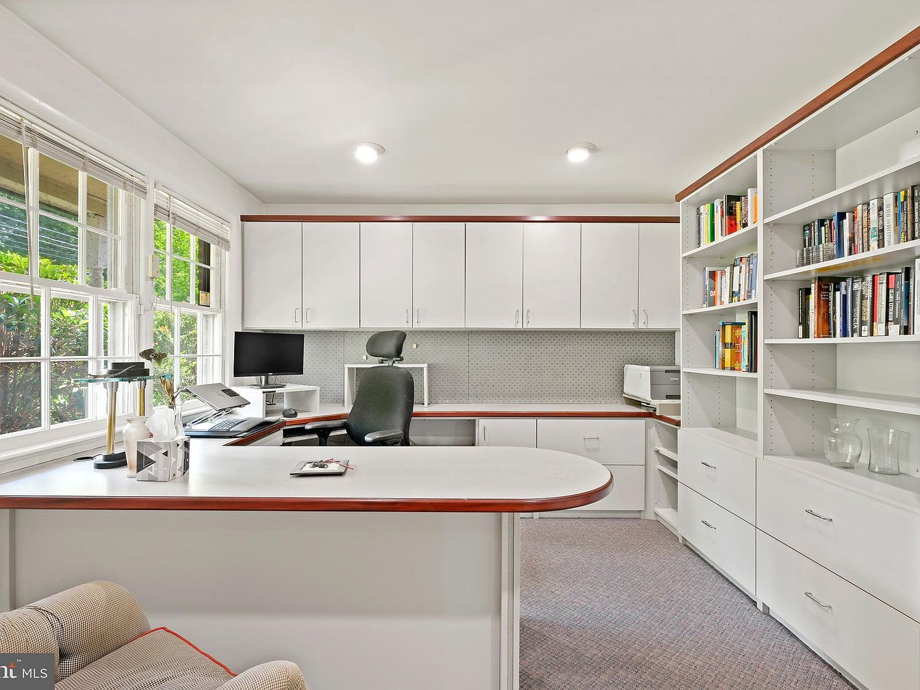 This organized home office features a large L-shaped built-in desk with a smooth white surface accented by warm wooden trim that complements the cabinetry. The workspace is surrounded by extensive white cabinetry and shelving, providing ample storage for books, office supplies, and electronics. A plush, neutral-toned carpet softens the floor beneath a comfortable ergonomic office chair. Natural light streams in through expansive multi-pane windows, enhancing the clean and bright aesthetic. The overall look combines practical functionality with a calm, inviting atmosphere ideal for focused work or study.