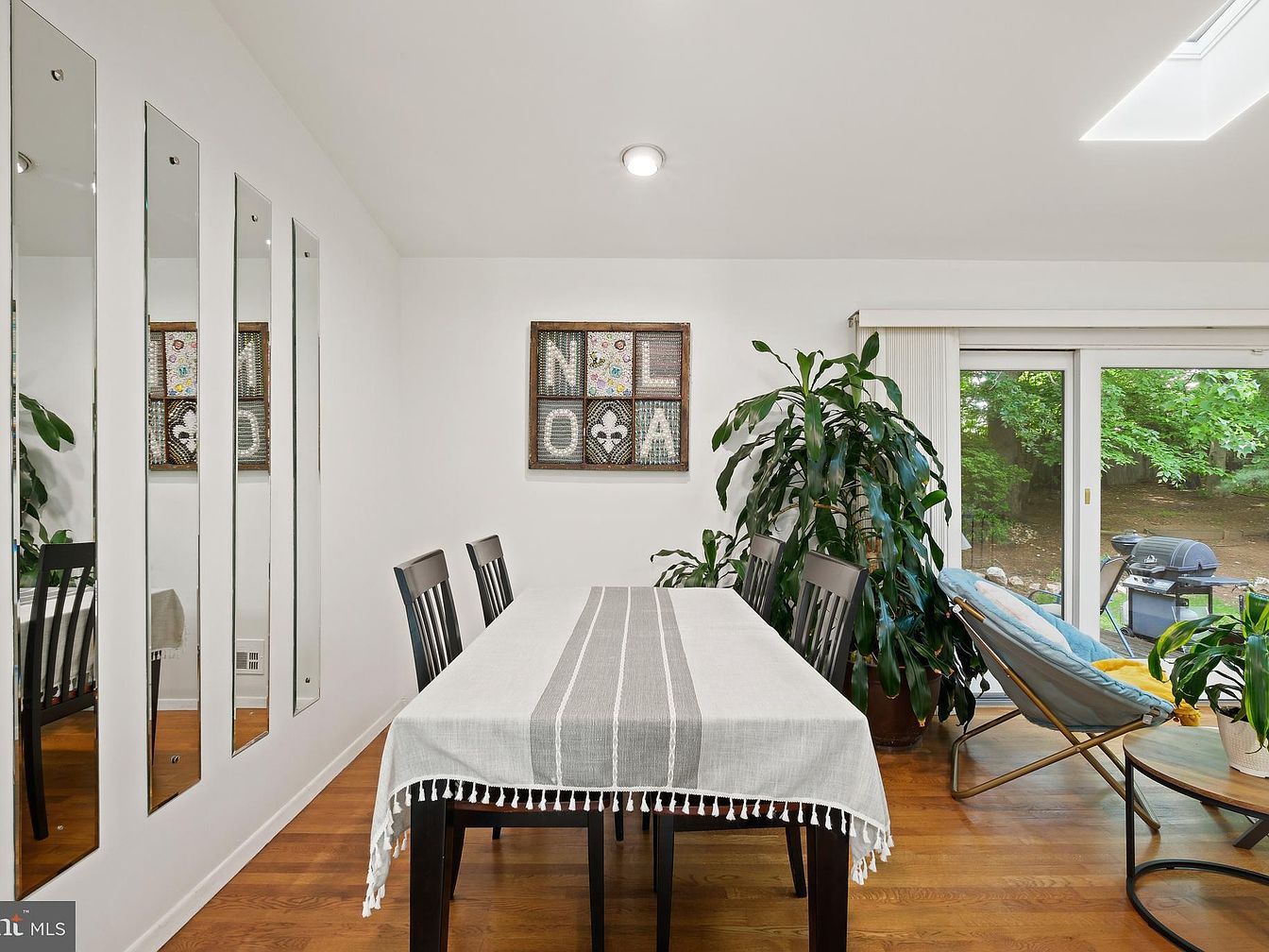 This dining area features a minimalist design with clean white walls and warm hardwood flooring. A rectangular dining table seats six, draped with a light gray and white striped tablecloth that adds subtle texture. Along one wall, four narrow vertical mirrors enhance the sense of space and light. Opposite the mirrors, a large potted plant provides a natural accent beside sliding glass doors that open to a green backyard, inviting nature indoors. A casual lounge chair with soft cushions sits nearby, blending comfort with functionality, while a small round table holds an additional plant, emphasizing a fresh, airy ambiance.