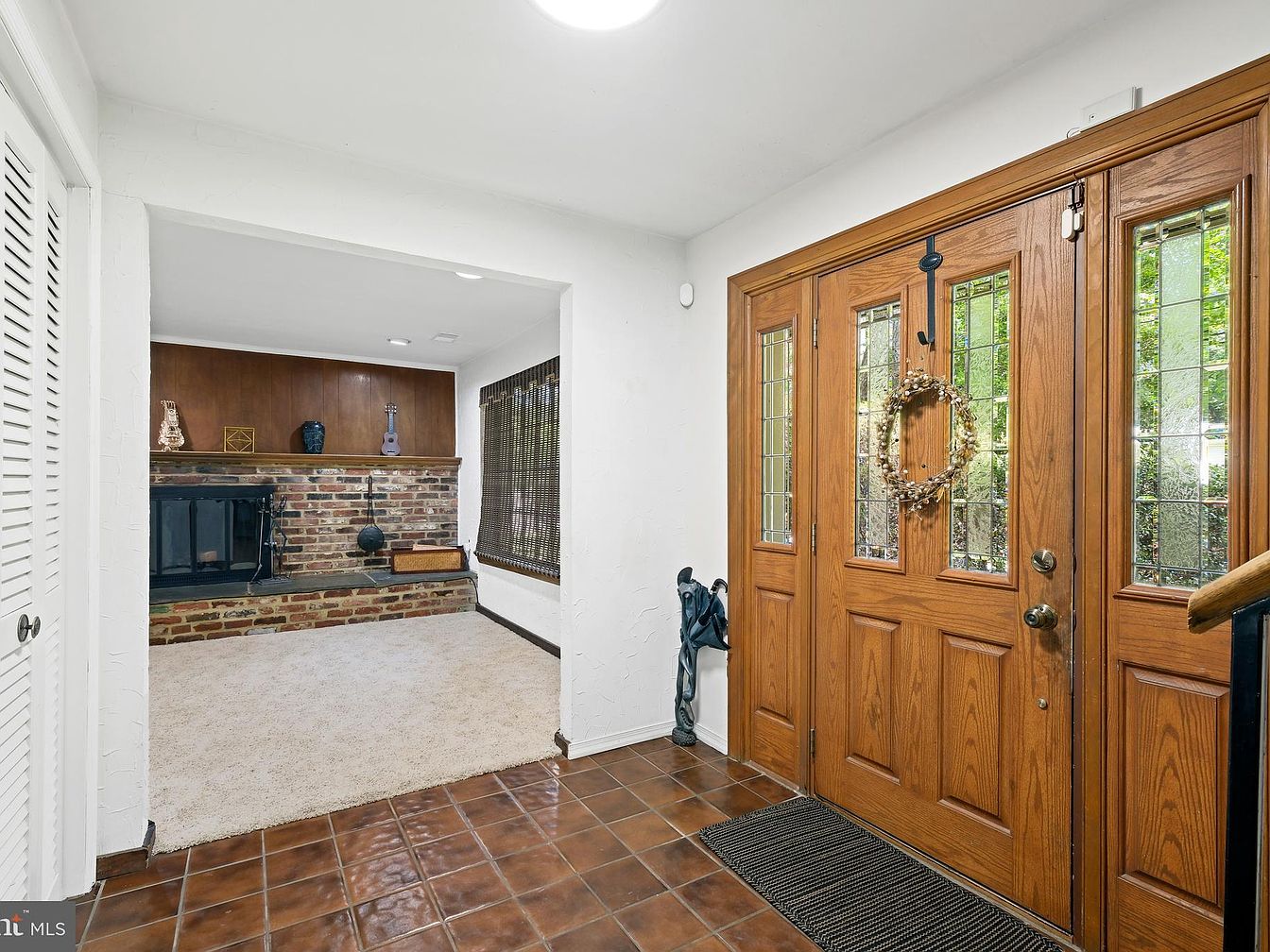 This inviting entryway features rich, warm wood double doors with decorative glass panels, giving a classic and welcoming vibe. The floor is tiled with a glossy brown finish, complemented by a dark entry mat for practical elegance. Adjacent to the entry is a cozy nook carpeted in a neutral beige tone, anchored by a charming brick fireplace with a dark mantle and wood-paneled backdrop. The textured white walls add contrast and brightness, while a large window with woven shades introduces natural light. The blend of earthy and warm textures creates a comfortable and inviting transition space into the home.