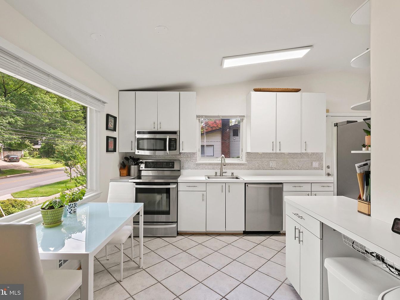 This kitchen features a clean, modern aesthetic with a predominantly white color scheme enhancing the spacious feel. White cabinetry with sleek silver handles contrasts subtly with the stainless steel appliances, including a microwave, oven, dishwasher, and refrigerator. A light mosaic tile backsplash adds texture above the countertops. The flooring is tiled in a diamond pattern, complementing the white theme. A bright window over the sink and a larger window by the dining area invite natural light, illuminating the glass-top dining table with white chairs. A built-in counter space and minimalist decor complete the practical yet stylish layout.