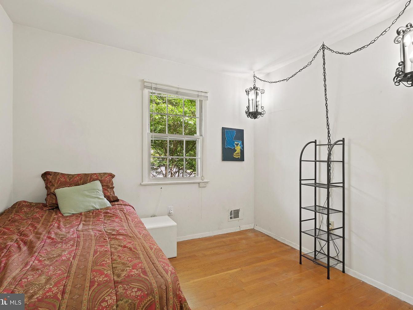 This small bedroom corner features a single bed dressed in a warm, patterned duvet with earthy red and gold hues, complemented by a single sage green pillow. Natural light flows through a white-framed window with horizontal blinds, brightening the otherwise minimalist space. The walls are painted a crisp white, balancing the room’s warmth and simplicity. A black metal shelving unit stands against one wall, adding subtle industrial charm and functionality. Two ornate lantern-style wall lights with hanging chains provide a unique vintage touch, contrasting gently with the wooden flooring and the modern minimal decor.
