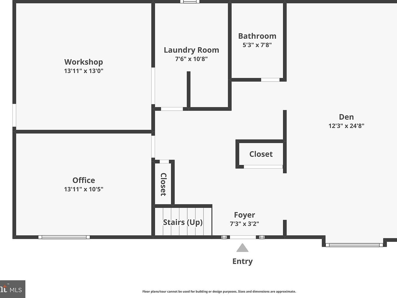 This lower level layout includes a spacious den measuring 12’3″ by 24’8″, ideal for versatile living or entertainment space. Adjacent to the den is a bathroom of compact size 5’3″ by 7’8″, positioned for convenience. A dedicated laundry room, measuring 7’6″ by 10’8″, offers ample space for household chores. There is a workshop area sized 13’11” by 13’0″, suitable for projects or hobbies, alongside an office space of 13’11” by 10’5″ with natural light from a window. The floorplan also features closets and stairs leading upstairs from a compact foyer at the entry, designed for efficient use of space and functional flow.