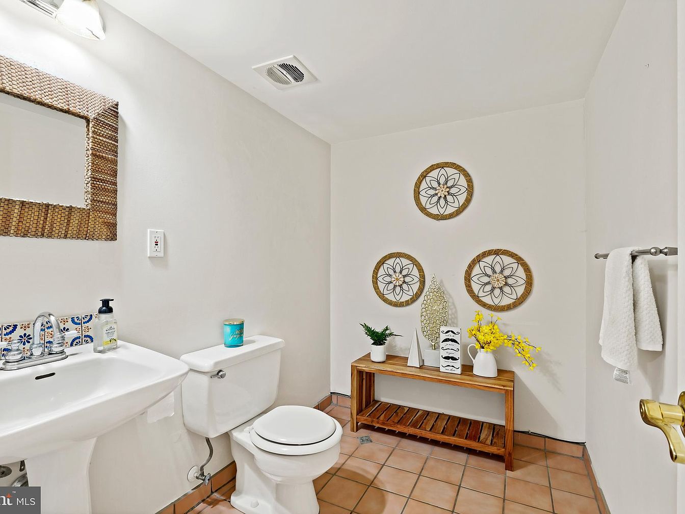 This guest bathroom features a warm and inviting terracotta tile floor contrasted with crisp white walls and fixtures. A white pedestal sink with chrome faucets is accompanied by a hand towel on the wall and a soap dispenser. Above the sink, a mirror framed in textured, rustic wood adds natural warmth to the clean space. A white toilet sits beside a wooden console table that serves as a decorative and functional element, adorned with plants, a vase of bright yellow flowers, and artistic objects. Three circular wall hangings with intricate floral designs integrate a sophisticated yet relaxed aesthetic.