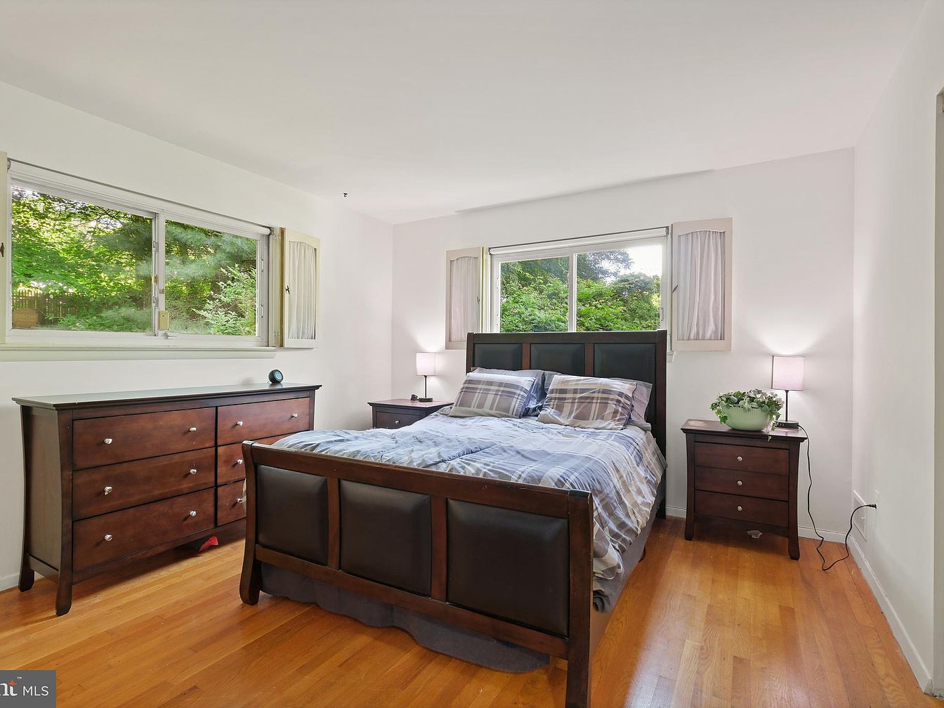 This master bedroom combines clean, minimalist design with classic wood tones. The bed features a dark wooden frame with leather panel detailing on headboard and footboard, dressed in muted plaid bedding that complements the room’s understated palette. Flanking the bed are two matching dark wooden nightstands topped with modern lamps emitting soft, warm light. Across from the bed sits a spacious matching dresser with ample storage. White walls and two windows, framed with pale wood shutters, invite abundant natural light and views of lush greenery outside. Honey-toned hardwood flooring anchors the space with warmth and simplicity.