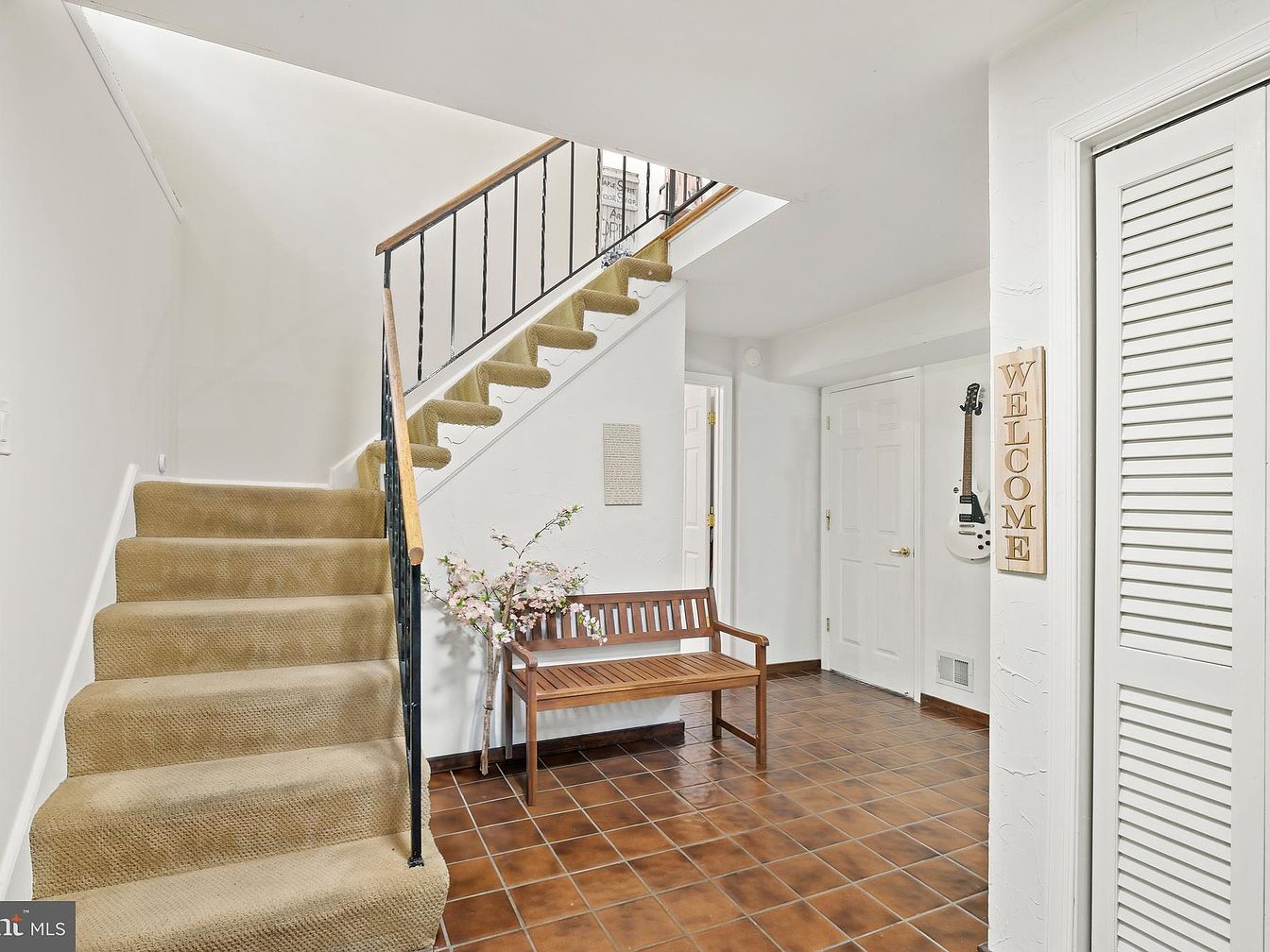This entryway features a warm, inviting ambiance with earthy terracotta floor tiles and creamy beige carpeted stairs. The staircase ascends to the upper level with a black metal railing topped by a natural wood handrail, complementing the bench nearby. The bench, made of medium-toned wood, adds both practical seating and a welcoming touch. A delicate faux floral arrangement softens the corner, enhancing the cozy feel. White walls and doors maintain brightness, paired with gold hardware for subtle elegance. A “WELCOME” sign and a guitar mounted on the wall add personalized charm, blending functionality with tasteful decor.