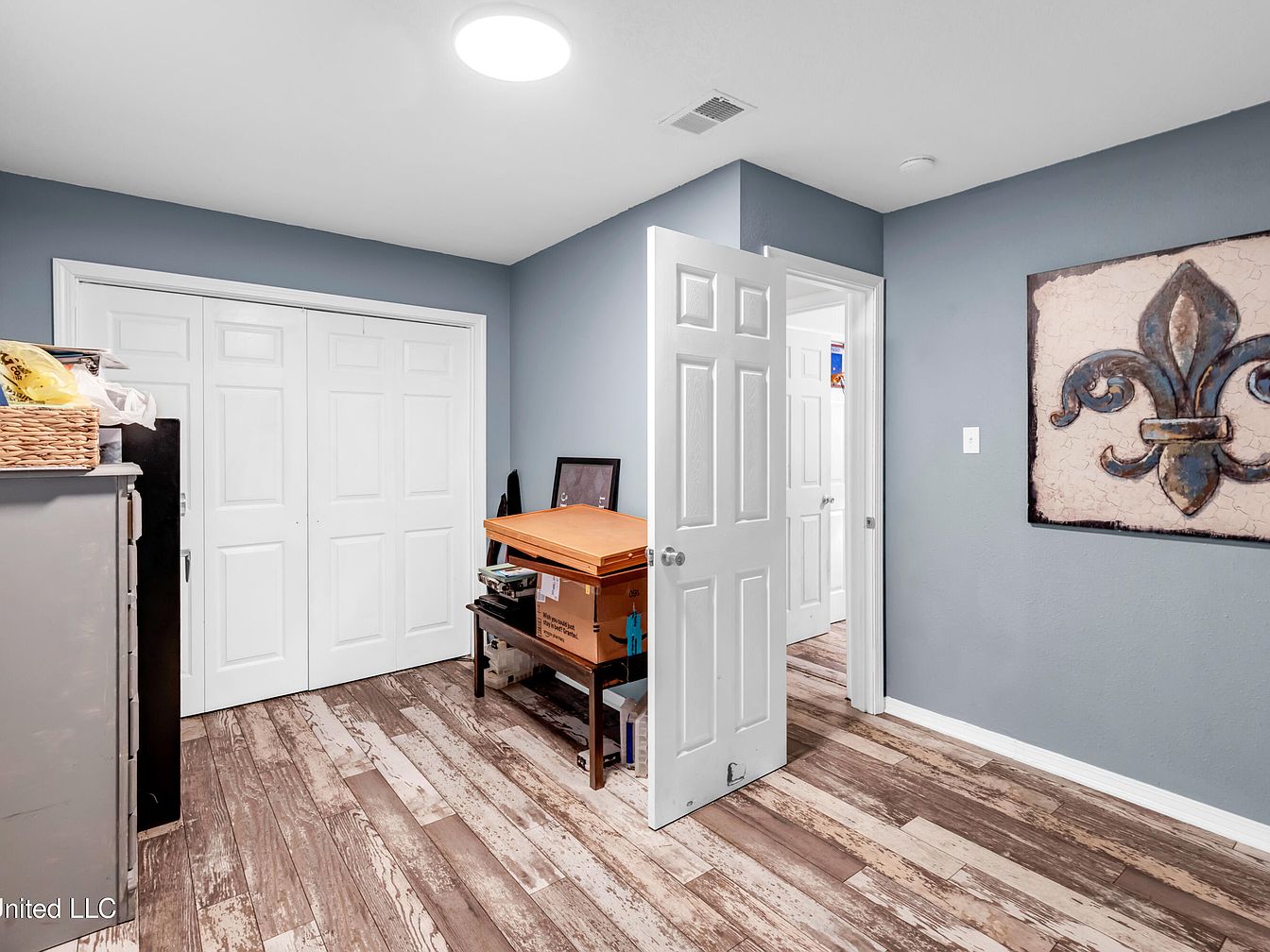 This cozy spare room features calming blue-gray walls paired with white trims and doors, creating a clean, modern look. The floor showcases a textured wood-style laminate with varying shades that add warmth and character to the space. A pair of white bi-fold closet doors provide hidden storage, while an open single door leads to an adjoining room or hallway. A simple yet elegant artwork hangs on one wall, bringing a touch of personality. The room currently holds a small bench stacked with boxes and framed items, suggesting flexible use for storage or a home office setup.