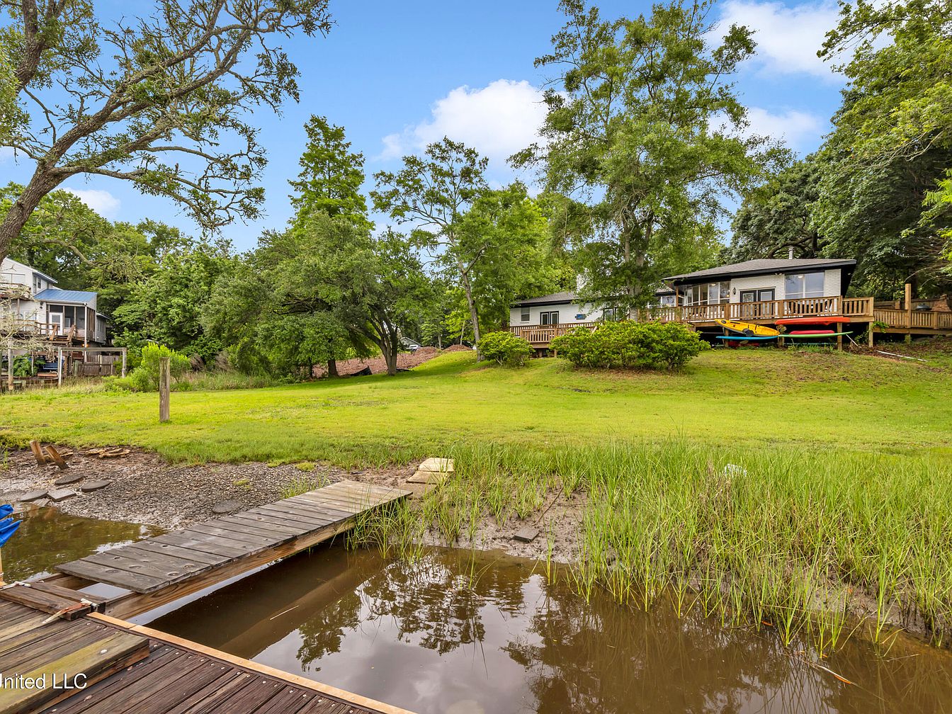 A serene backyard space extends from the home’s rear to a private dock on the water. The lawn is lush and green, bordered by a mix of mature trees and bushes that provide natural shade and privacy. A wooden dock stretches into the calm water, offering access for small boats or peaceful shoreline relaxation. The home’s exterior features a wooden deck with railings, perfect for outdoor seating or gatherings, with racks containing colorful kayaks underneath, suggesting a lifestyle emphasizing outdoor water activities. The overall ambiance is tranquil and inviting, blending natural elements with functional outdoor living.