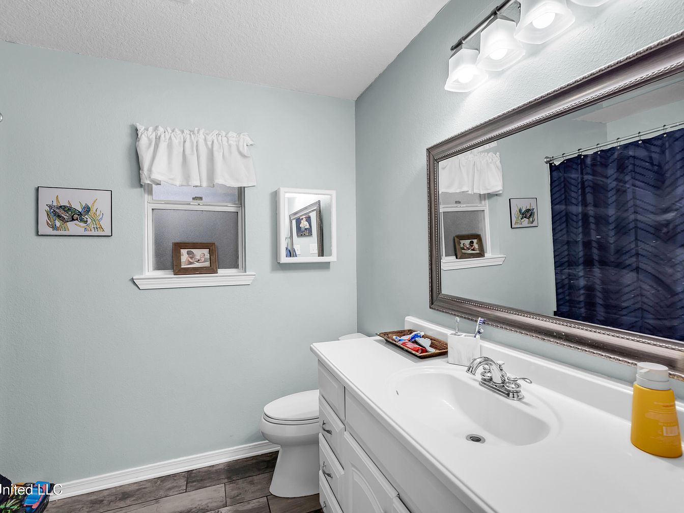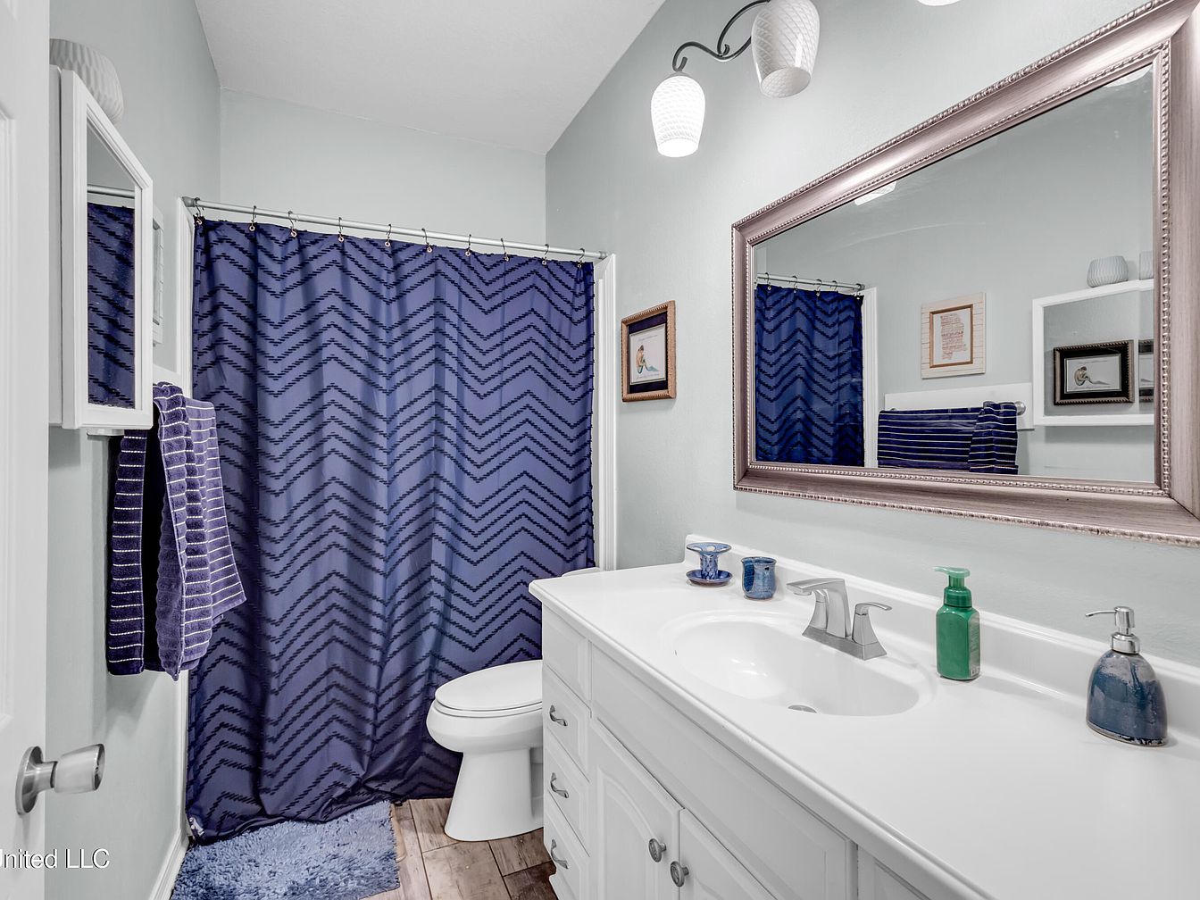 This bathroom features a clean and streamlined vanity with a white countertop and cabinetry, complemented by a silver-framed mirror spanning the length of the sink. The walls are painted a soft, calming blue-gray, contributing to a serene atmosphere. Above the mirror, a modern light fixture with three frosted glass shades brightens the space. The flooring is a realistic wood-look tile in neutral grayish-brown tones that adds warmth and texture. Accents include a small window dressed with a white ruffled valance, a navy-blue shower curtain, and minimal decorative touches like framed artwork and a wicker tray holding toiletries for a subtle, cozy touch.