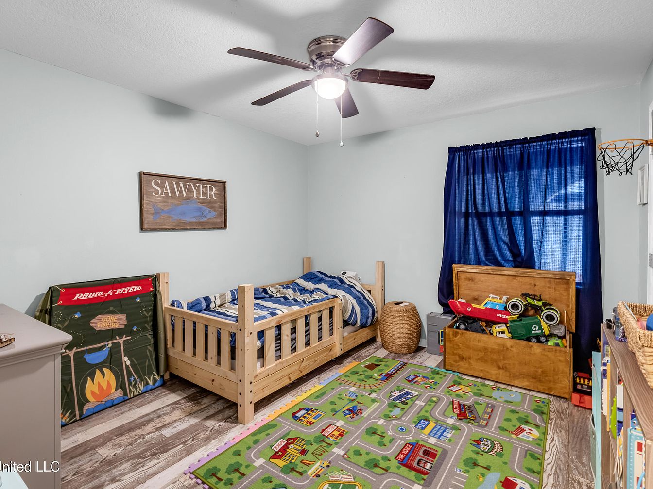 This cozy child’s bedroom features a rustic yet playful style, centered around natural wood finishes and vibrant accents. The small wooden bed with simple slats is paired with a striped blue, white, and gray comforter, complementing the room’s muted gray walls. The flooring mimics weathered wood planks, adding to the warm, cottage-like feel. A colorful play mat with a city road design covers part of the floor, encouraging imaginative play. A wooden toy chest overflowing with trucks and cars sits beneath a deep blue curtain covering the window, while a wicker basket and a small basketball hoop add character and practicality. A ceiling fan with dark wooden blades provides comfort and blends with the overall aesthetic.