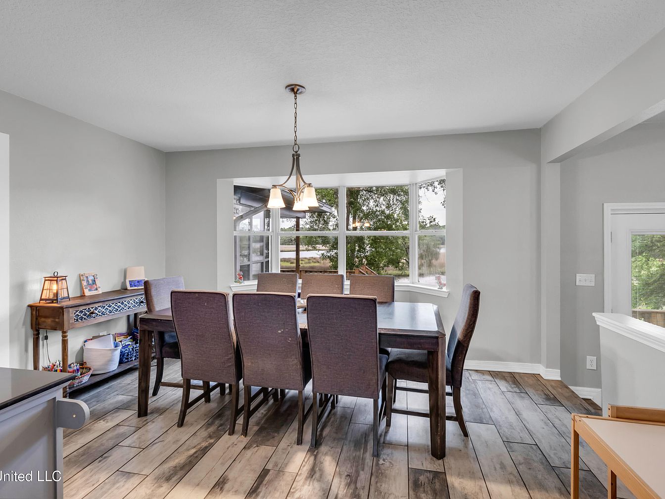 This dining space features a large, dark wood table paired with eight high-backed chairs upholstered in a muted gray fabric. The floor is finished with wood-look tile planks, adding warmth and texture to the room. One wall showcases a prominent bay window overlooking a natural outdoor scene, allowing ample light to flow in, enhancing the neutral gray walls. A bronze-finished chandelier with three frosted glass shades hangs centered above the table. To the left, a narrow wooden console table with decorative tile faces is neatly styled with a lamp and personal items, balancing functionality and charm.