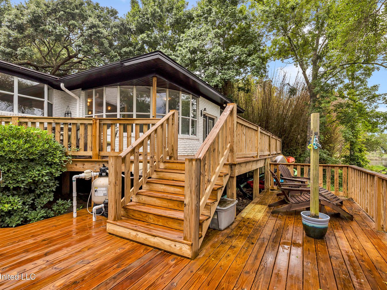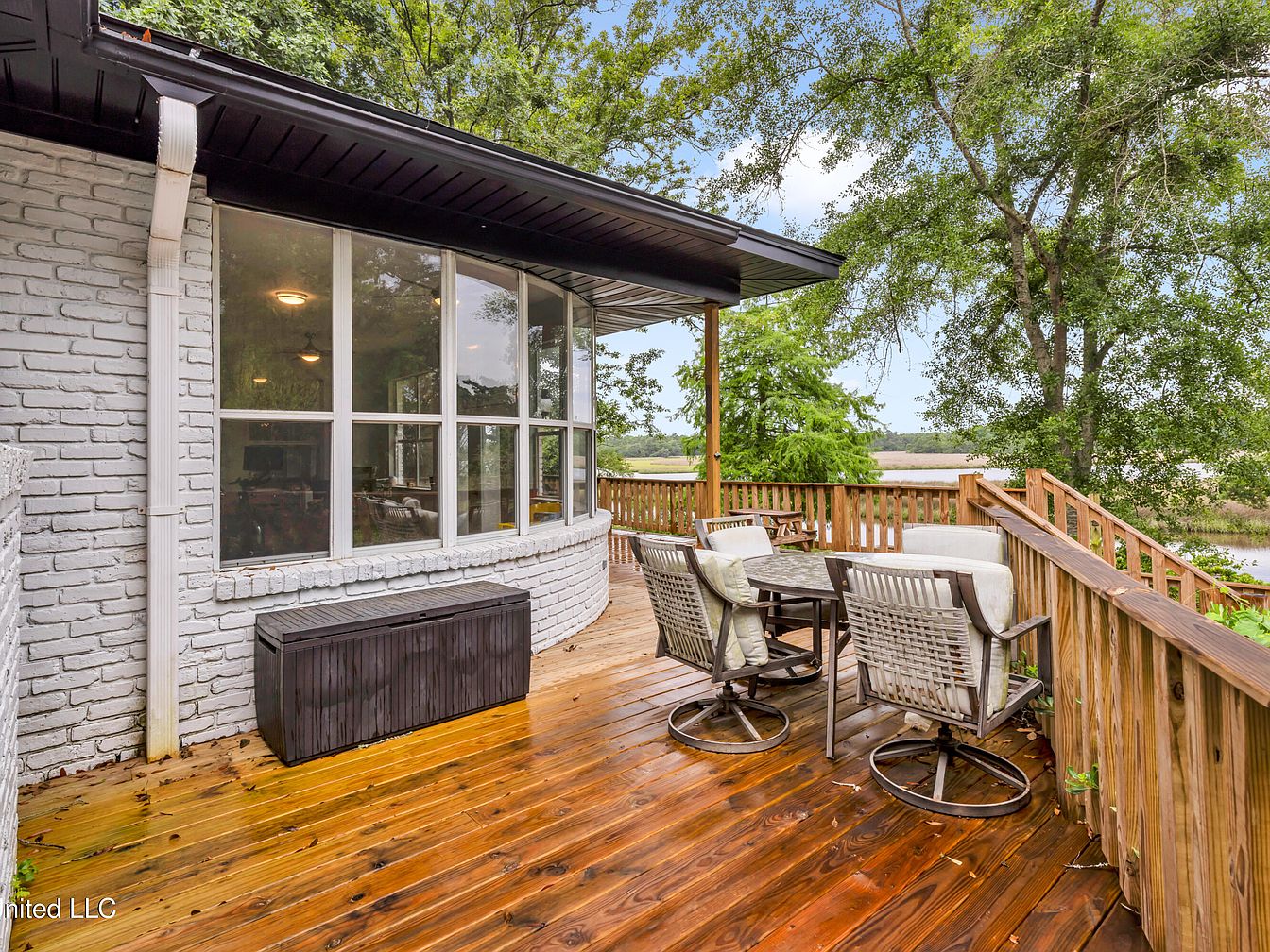 This inviting outdoor deck features polished wooden flooring with a rich, warm tone, complemented by a natural wooden railing that blends seamlessly with the surrounding greenery. Comfortable cushioned metal swivel chairs surround a round dining table, creating an ideal spot for outdoor meals or socializing. The deck wraps around a curved exterior wall of the home, painted in light gray brick, enhancing the cozy yet refined feel. Large windows offer a view of the interior while allowing natural light to flood inside. Mature trees and a scenic water view add tranquility to this charming outdoor living space.