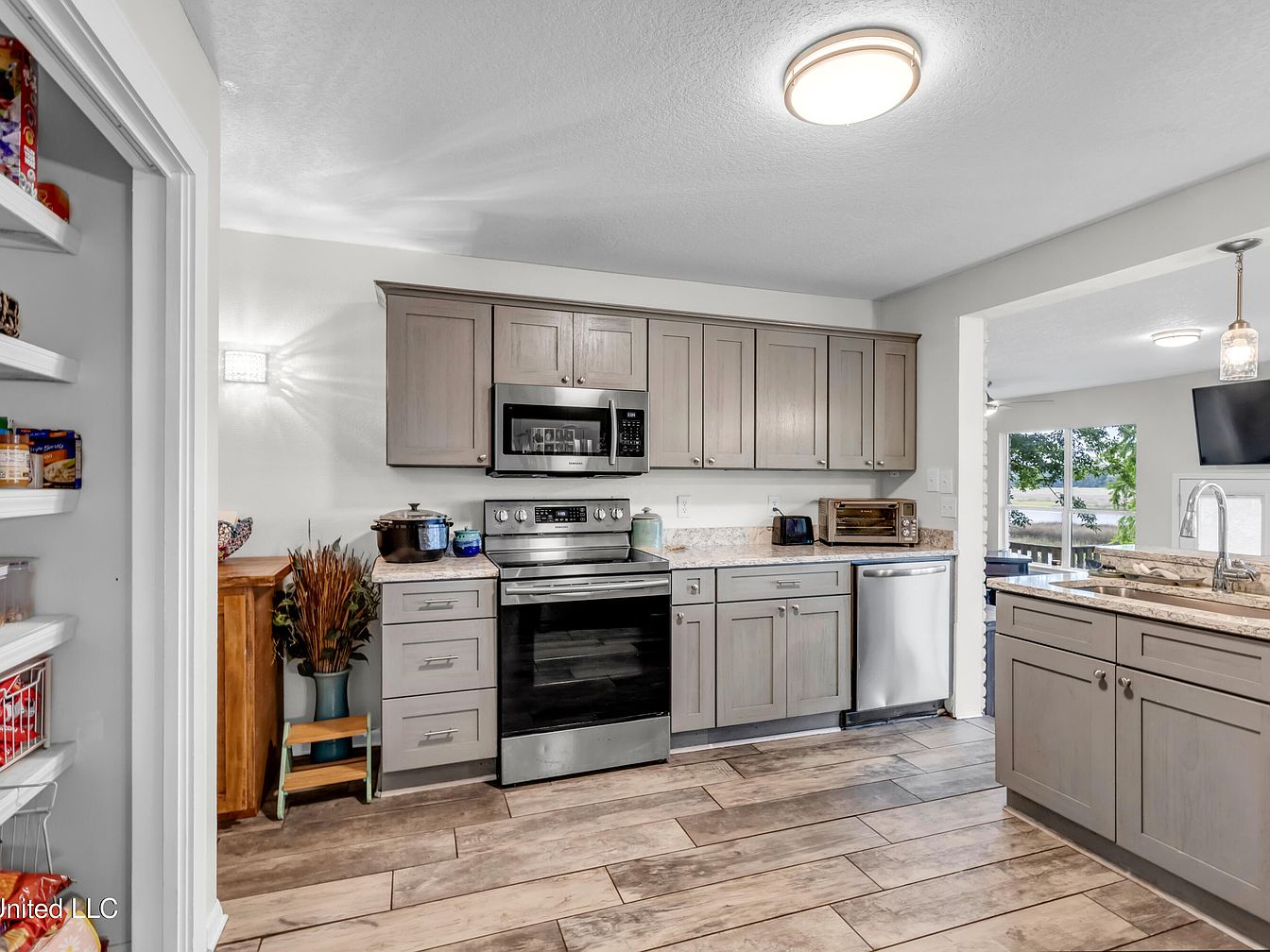 This kitchen features a contemporary design with a neutral palette emphasizing gray cabinets with a subtle wood grain finish. The cabinetry stretches across the wall, offering ample storage and housing sleek stainless steel appliances including a microwave, stove, and dishwasher. The countertops display a muted marble pattern that complements the cabinetry. Light-colored walls and a textured ceiling enhance brightness from the central flush-mount ceiling light and pendent lighting over the adjacent island. The floor resembles wide wooden planks in warm tones, adding natural warmth. An open doorway connects the kitchen to a dining area with large windows showcasing outdoor greenery.