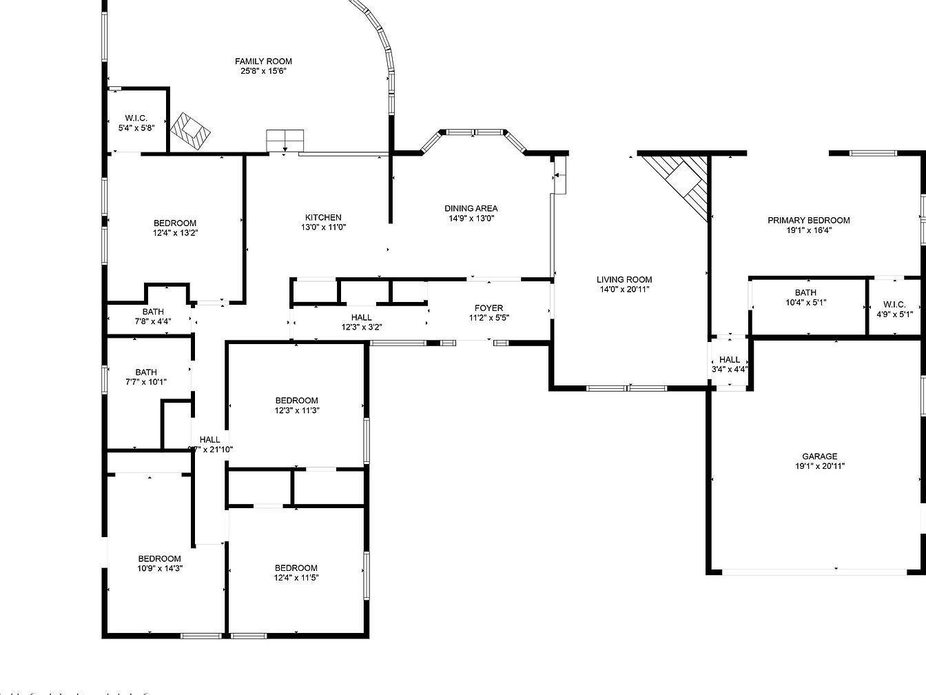 This detailed floor plan presents a spacious single-level home layout with multiple bedrooms and shared living spaces. The layout includes a large family room with curved windows, a kitchen adjacent to a dining area, and a separate living room featuring a fireplace. The primary bedroom boasts an en-suite bath and walk-in closet. Two additional bathrooms serve the other bedrooms, which are grouped in a separate wing for privacy. The design integrates hallways for easy navigation between rooms and an attached garage providing convenient access to the home. This layout balances private and communal spaces efficiently.