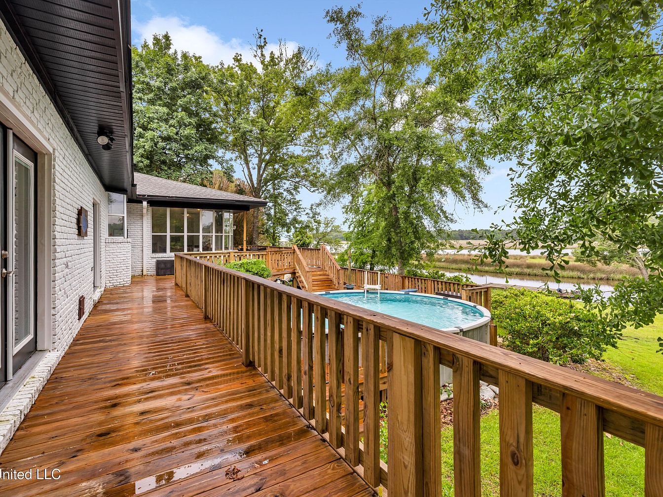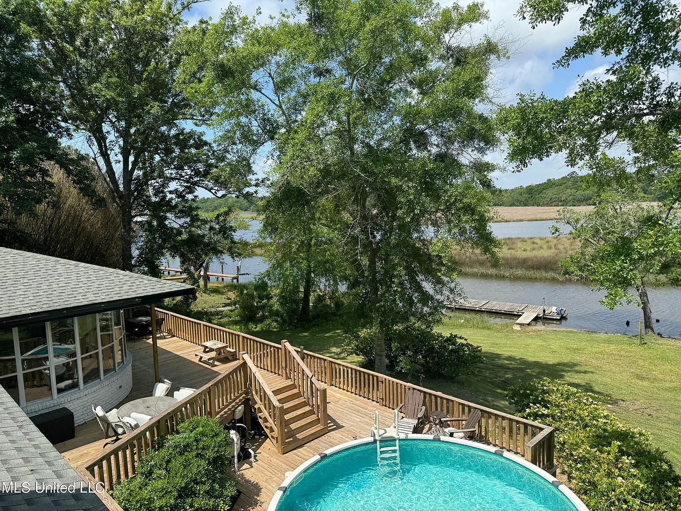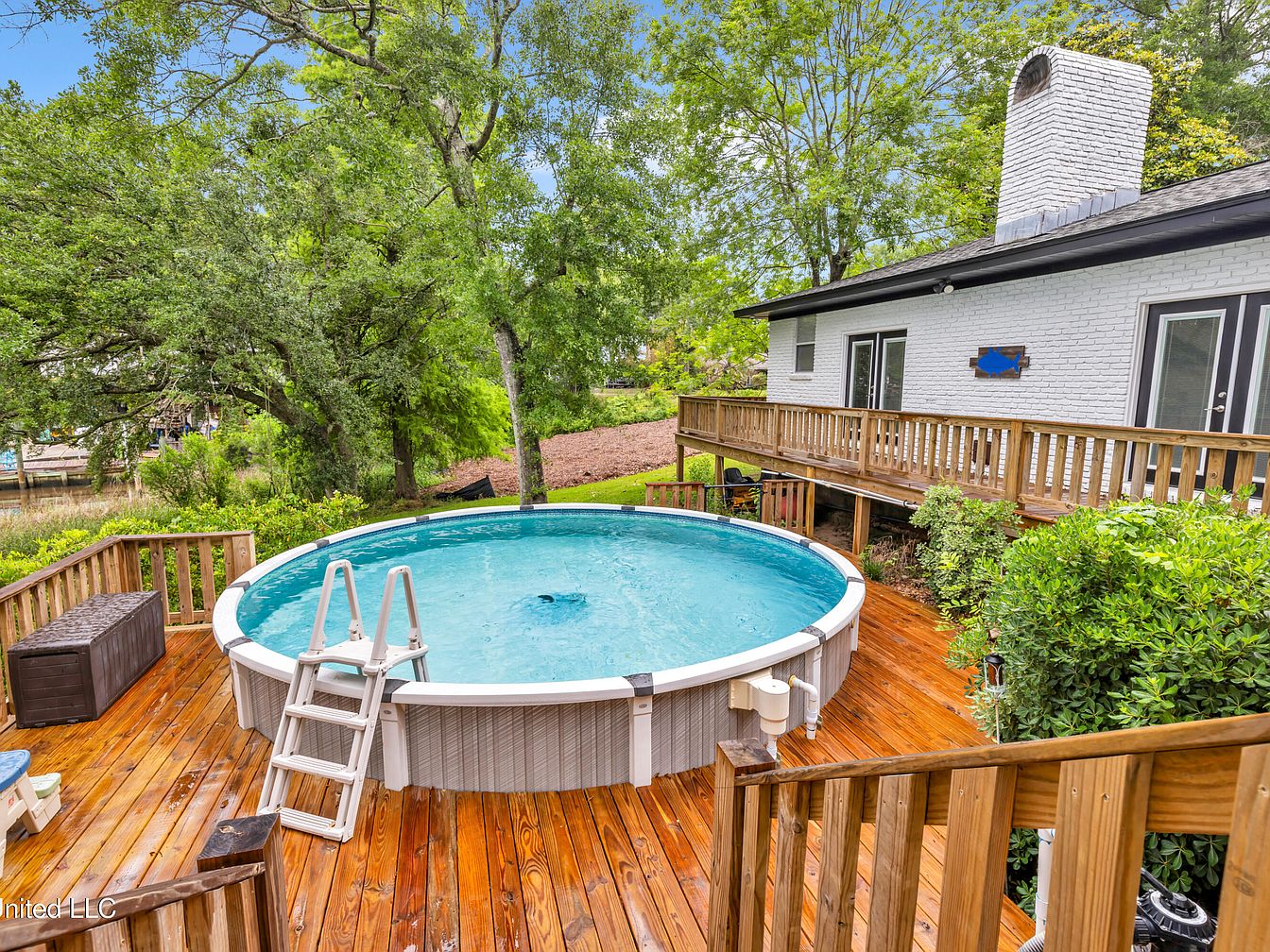 This inviting backyard deck extends from the home’s white brick exterior and features rich, natural wood planks with a fresh, slightly wet finish, enhancing the rustic feel. The deck’s wooden railing offers safety and a streamlined look, leading down to a charming circular above-ground pool, surrounded by lush greenery. Mature trees provide ample shade and create a serene atmosphere, blending beautifully with the estate’s natural setting. Beyond the pool, expansive views of the water and open greenery add to the picturesque and tranquil outdoor space, ideal for relaxation and entertaining.
