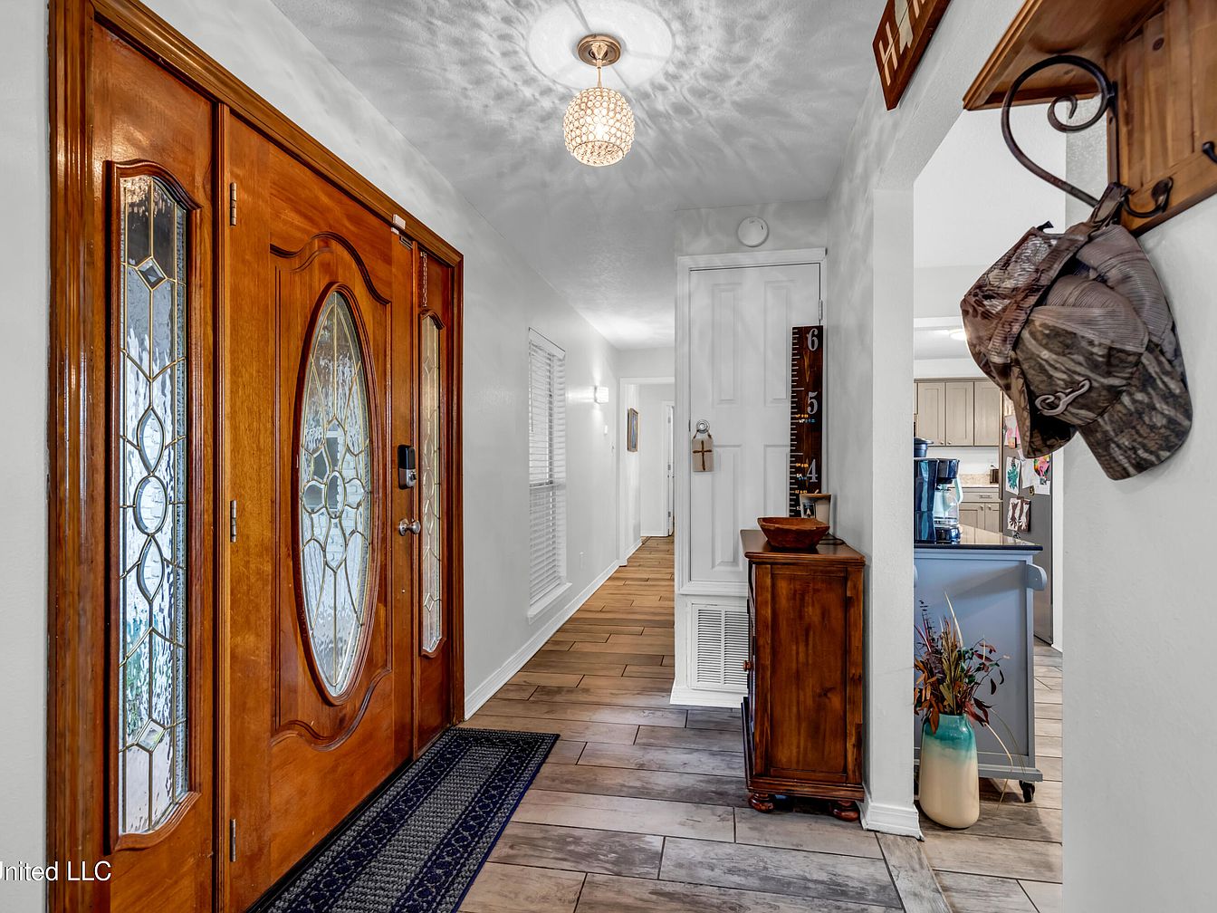 Warm wooden accents greet you with a beautifully carved front door featuring intricate oval glass panels flanked by sidelights with matching decorative glass. The hallway extends deeper into the home, its white walls brightening the space and highlighting the light wood-look tile flooring that runs throughout. A modest wooden console table complements the door’s rich tones, accompanied by a rustic cornice mounted above for hanging hats and coats, fostering a cozy welcome. Soft lighting from a faceted globe ceiling fixture adds gentle ambiance, showcasing a neat, functional path that leads toward the kitchen and other living areas.