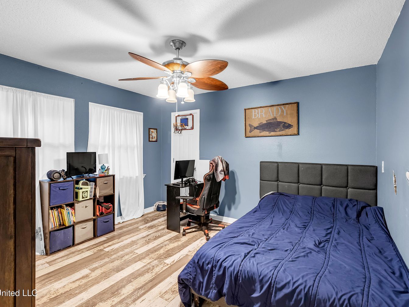 This cozy bedroom features a calming blue color scheme on the walls, paired with light wood-toned plank flooring that adds warmth and texture. The space efficiently combines rest and productivity with a black cushioned headboard bed dressed in a rich navy comforter. Opposite the bed, a compact workspace includes a black desk with a gaming-style chair, positioned for natural light from two large windows draped in sheer white curtains that brighten the room. A multi-compartment storage unit stands nearby, holding books, bins, and a small TV, while a ceiling fan with wooden blades meets both function and style overhead.