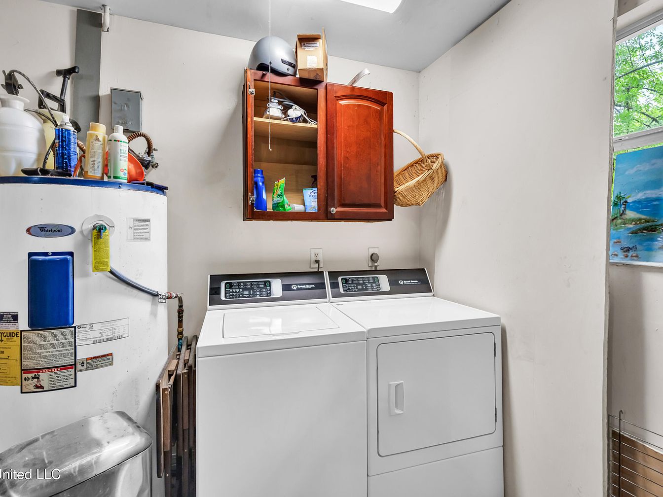 This compact laundry room features a practical layout with a white top-load washing machine and matching dryer standing side by side beneath a wall-mounted wooden cabinet. The cabinet has a rich cherry finish, providing a warm contrast against the light, neutral walls. Inside the cabinet are laundry essentials and cleaning products, while a wicker basket hangs discreetly on one side. Adjacent to the washer and dryer is a large Whirlpool water heater with additional household supplies resting on top. Natural light filters through a window partially visible to the right, brightening the otherwise utilitarian space.