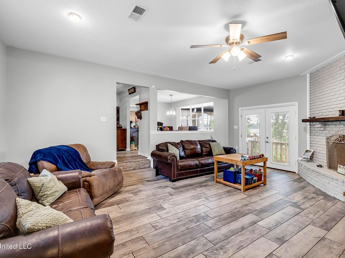 The living room features an open, inviting layout with light gray walls that create a calm, neutral backdrop. The flooring resembles wide plank wood with a distressed finish, adding rustic charm. Seating includes two large brown leather sofas and a matching armchair adorned with textured throw pillows and a cozy blue blanket. A ceiling fan with wooden blades offers both style and function overhead. A whitewashed brick fireplace anchors one wall, complemented by a wooden mantel. French doors provide access to the outdoor deck, allowing natural light to fill the space and enhance the airy feel.