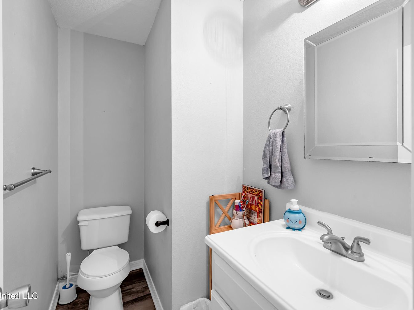 This compact bathroom combines functionality with a subtle modern aesthetic. The color palette features soft gray walls that enhance the space’s brightness, offset by a white toilet and a matching vanity with a smooth countertop. A rectangular mirror with a simple frame hangs above the sink, reflecting light to further open the room visually. The faucet and towel ring are finished in brushed nickel, contributing to a cohesive, understated look. Dark wood-inspired flooring adds warmth and contrast to the space. The corner countertop holds a cheerful blue soap dispenser, adding a touch of personality to the clean, streamlined design.