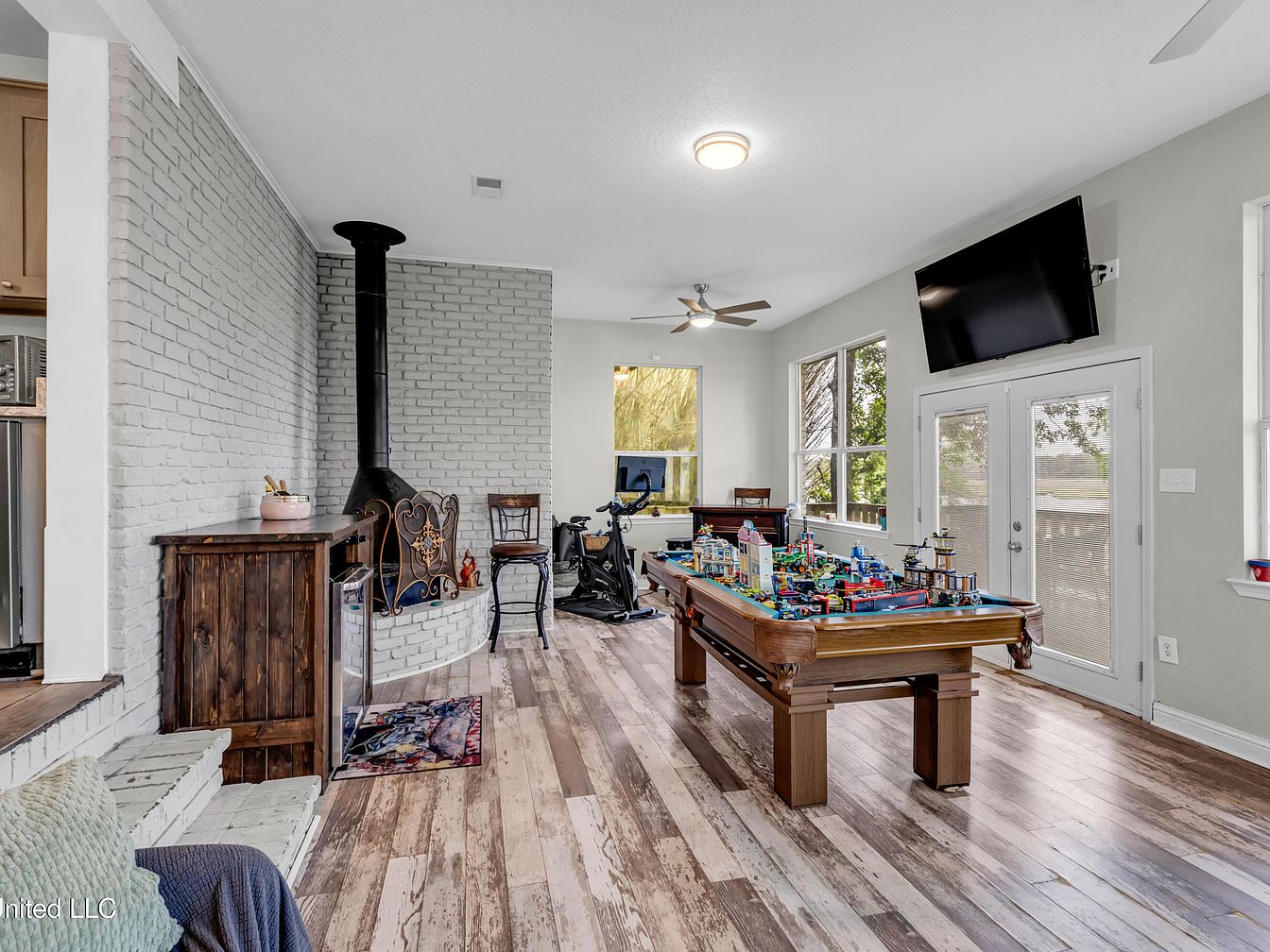This spacious recreation area features rustic wood-look flooring with varied tones that add warmth and texture. A whitewashed brick wall houses a striking black vintage-style fireplace with a curved hearth, creating a focal point with a cozy feel. The room is illuminated by abundant natural light streaming through multiple large windows and glass doors leading outside. A large flat-screen TV is mounted above the French doors, ideal for entertainment. The centerpiece is a wooden pool table decked out as a detailed play surface. Additional seating, a stationary bike, and ceiling fans balance function with relaxed living in a neutral, inviting palette.