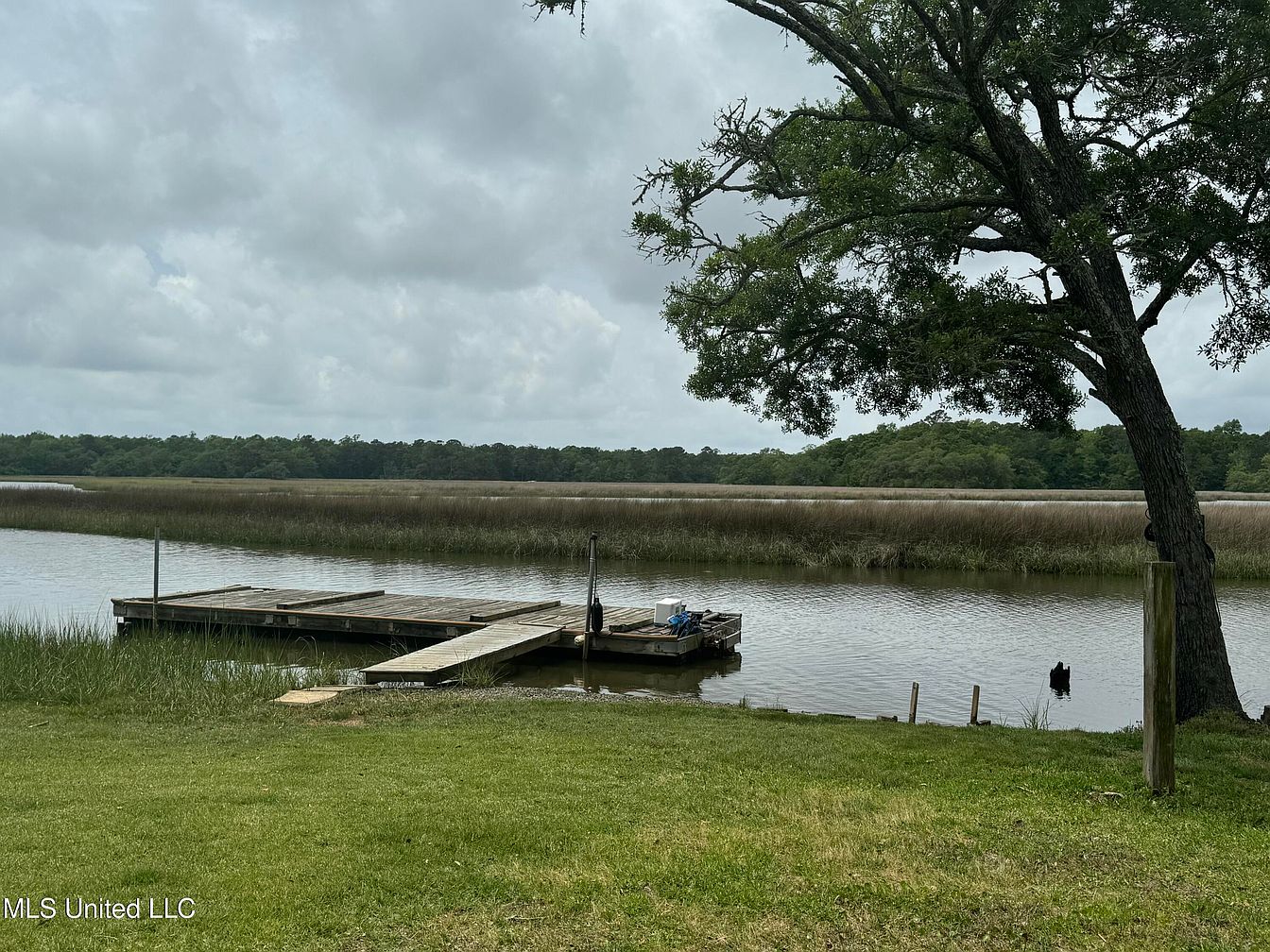 This serene backyard space features a wooden dock extending into calm waters, ideal for fishing or boating activities. The dock is connected to the grassy lawn by a small wooden ramp, merging land and water seamlessly. A large tree on the right offers natural shade and a touch of rustic charm to the setting. The surrounding landscape consists of reeds and marsh grasses, blending harmoniously with the tree line visible across the water. The neutral, earthy colors of green grass, brown dock wood, and blue-gray water create a peaceful, nature-inspired aesthetic, perfect for relaxing by the water’s edge.