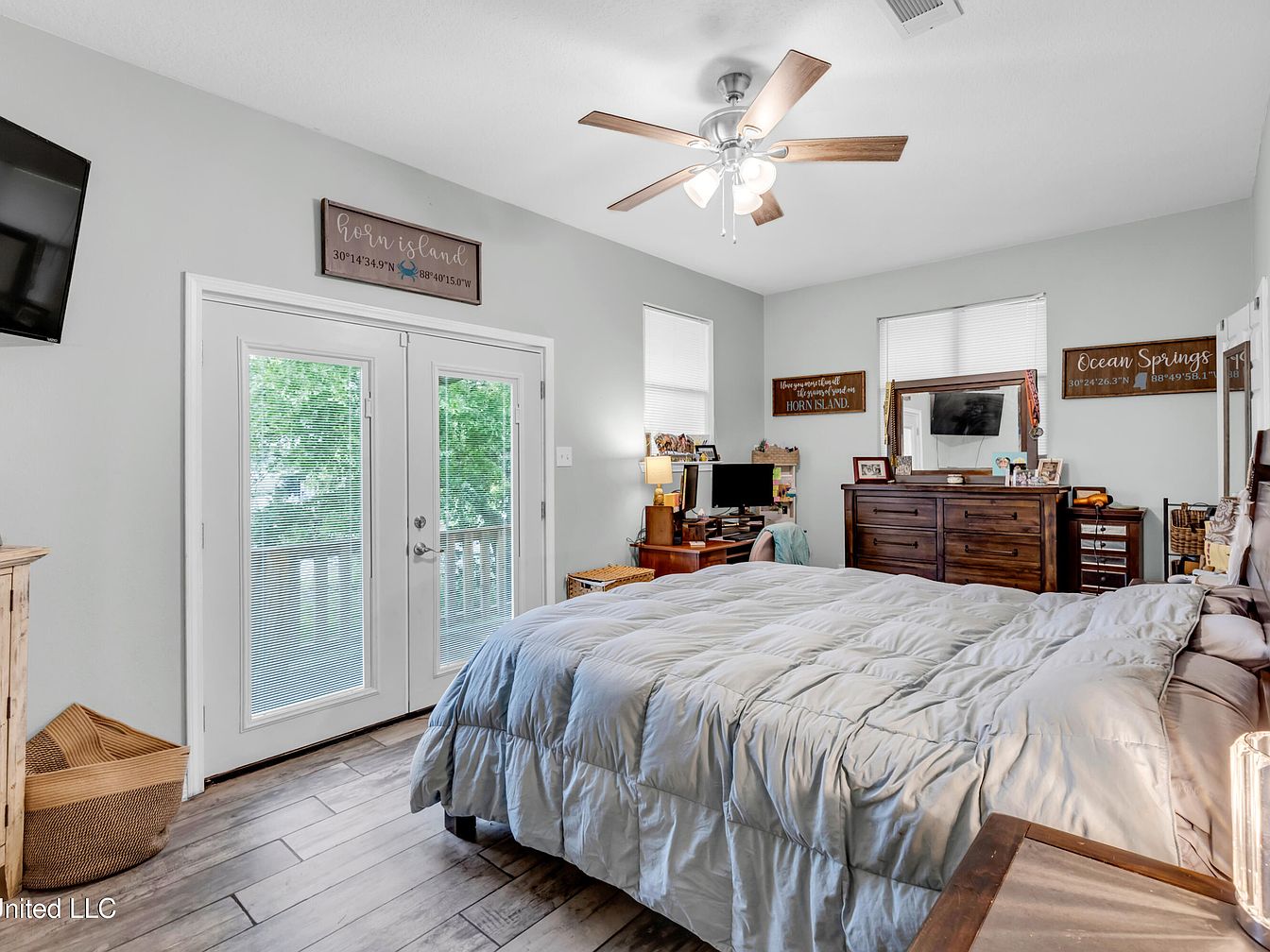 This spacious master bedroom features a calming neutral palette with light gray walls and warm wood-toned flooring, creating a peaceful retreat. A large bed with a soft, light gray comforter anchors the room, with matching wooden nightstands on either side. French doors with built-in blinds open to an outdoor space, allowing natural light to flood in. Opposite the bed, a dark wooden dresser topped with a matching mirror displays personal items, while a small desk with dual monitors fits neatly in the corner, blending practicality with comfort. Ceiling fan lighting complements the serene ambiance.