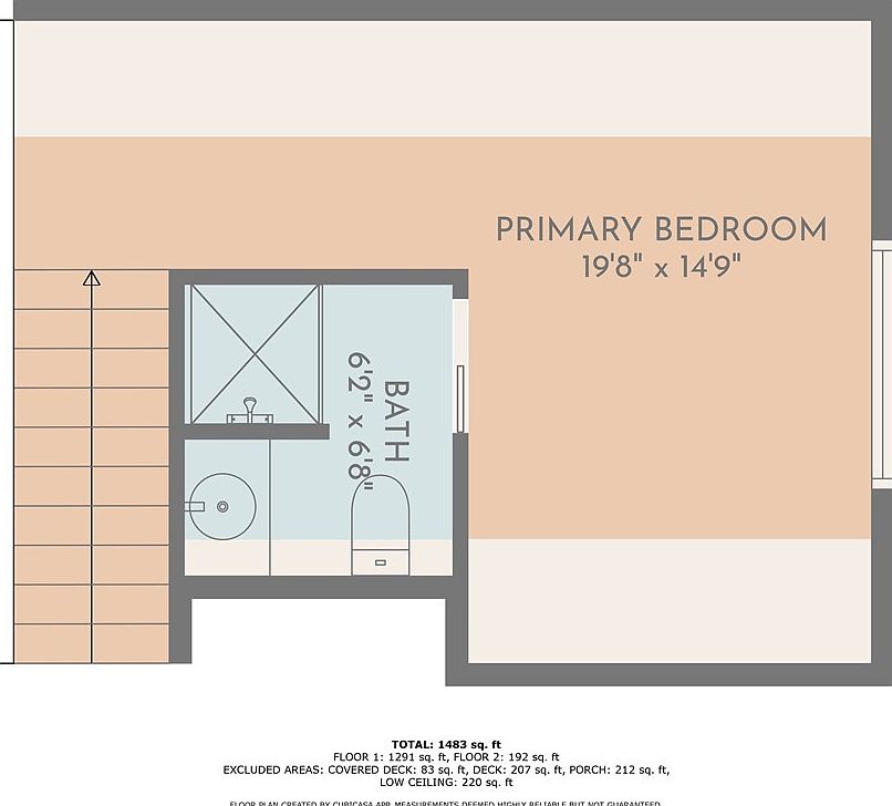 The layout highlights a spacious primary bedroom measuring 19’8″ by 14’9″, offering a significant area for versatile furniture placement and comfort. Adjoining the bedroom, a compact bathroom roughly 6’2″ by 6’8″ includes a shower, toilet, and sink, efficiently arranged to maximize usability in the limited space. The plan features stair access adjacent to the bathroom, indicating an upper-level location. Soft neutral tones differentiate the bedroom and bath zones, with a clear architectural emphasis on functionality and flow, integrating convenience while maintaining privacy in this part of the home.