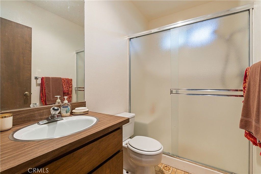 This compact bathroom features a warm, earthy color palette with wood tones dominating the vanity and countertop. The countertop has a simple, functional design housing a white oval sink with a chrome faucet. The mirror above spans the width of the vanity, enhancing the sense of space. The shower has sliding frosted glass doors with a silver trim, providing privacy and a clean, modern touch. A white toilet sits adjacent to the shower. Warm brown and orange towels add a cozy accent against the neutral beige walls, while the vintage patterned floor tile adds character and charm to the space.