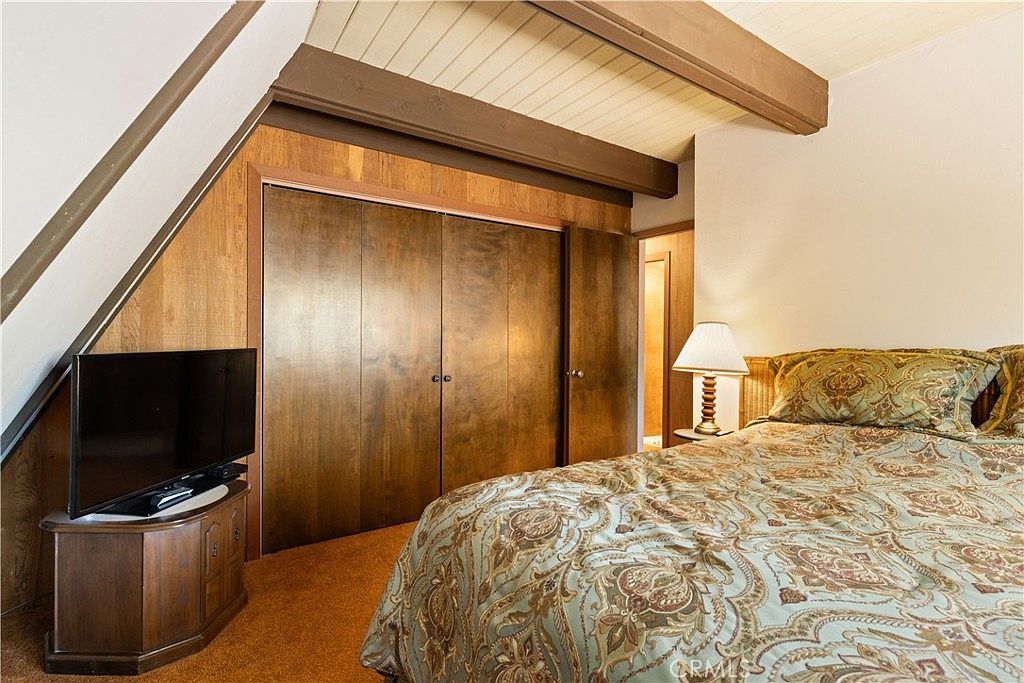 This intimate bedroom corner features a prominent set of wood-paneled sliding closet doors framed by matching wood trim, adding warmth and natural texture to the room. The slanted ceiling with exposed wooden beams enhances the cozy attic-like vibe. A patterned bedspread in muted earth tones brings an elegant yet vintage aesthetic, complemented by the matching pillow. A small wooden TV stand with a flat screen sits tucked beneath the sloped ceiling, maximizing space. Soft, brown carpeting underfoot completes the inviting atmosphere, while a table lamp casts a gentle glow near the bed, perfect for winding down.