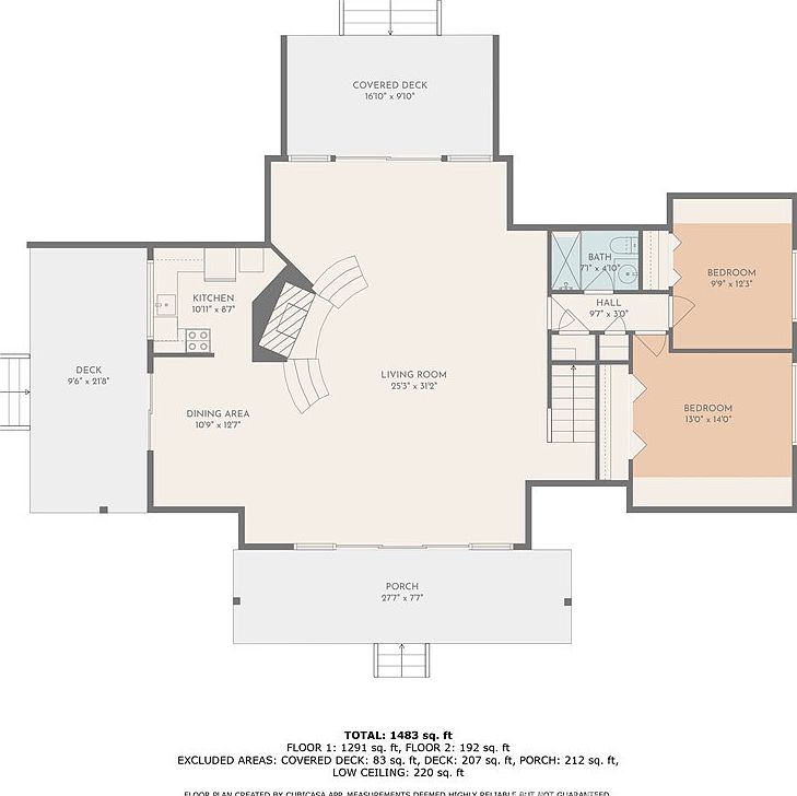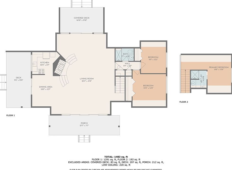This two-level home offers a spacious and functional layout with a total area of 1,483 sq. ft. The main floor features an expansive living room (25’3” x 31’2”) centrally located, providing a natural gathering spot with direct flow to the adjoining dining area and kitchen. The kitchen is compact yet practical, measuring 10’11” x 8’7”, and leads out to a deck ideal for outdoor entertaining. Two bedrooms and a full bath sit together, served by a hall linking to the staircase. Upstairs, a large primary bedroom (19’8” x 14’9”) enjoys privacy and includes a dedicated bathroom. The design emphasizes open communal spaces combined with private, restful zones. Multiple exterior access points include a covered deck and a spacious front porch enhancing outdoor living appeal.
