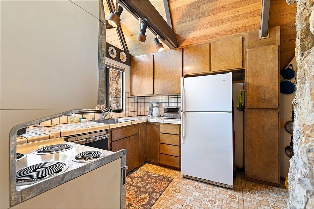 This compact kitchen features rustic wooden cabinetry extending to the ceiling, paired with a white tile countertop and backsplash, accented by dark grout lines for a vintage charm. The white appliances—a refrigerator and electric stove—contrast softly with the warm wood tones. A small window above the sink brings natural light into the space, highlighting the earth-toned linoleum floor patterned with retro floral motifs. Overhead track lighting with adjustable spotlights enhances the workspace, while stone wall details add texture and an inviting natural element to this functional and cozy kitchen nook.