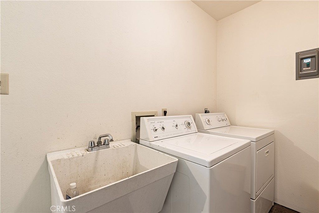 This compact laundry room features a straightforward layout with a white, deep utility sink on the left, ideal for hand washing or soaking clothes. Next to the sink, side-by-side white washer and dryer units are positioned neatly against the wall. The walls are painted a simple, neutral off-white color, maintaining a clean and practical atmosphere. Visible on the far wall is a metal electrical panel providing access to home’s utilities. The design prioritizes functionality, with minimal decor, making it a utilitarian space dedicated to laundry tasks.