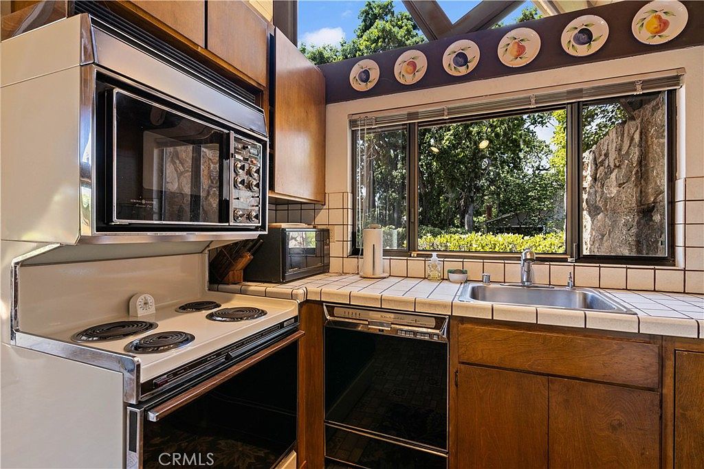 This kitchen area features a classic L-shaped layout with a focus on functionality and natural light. The countertop is tiled in a cream color with matching tiled backsplash, creating a warm, retro vibe. The cabinetry is wooden with a medium-brown finish, adding an earthy tone to the space. Appliances include a vintage-style stovetop and oven with chrome trim, complemented by a built-in microwave above. A black dishwasher is inset under the counter near a single stainless steel sink that sits below a large window. The window showcases a lush green view, framed by decorative plates on the wall above, contributing a charming, homey aesthetic. The design combines practicality with an inviting, nostalgic ambiance.