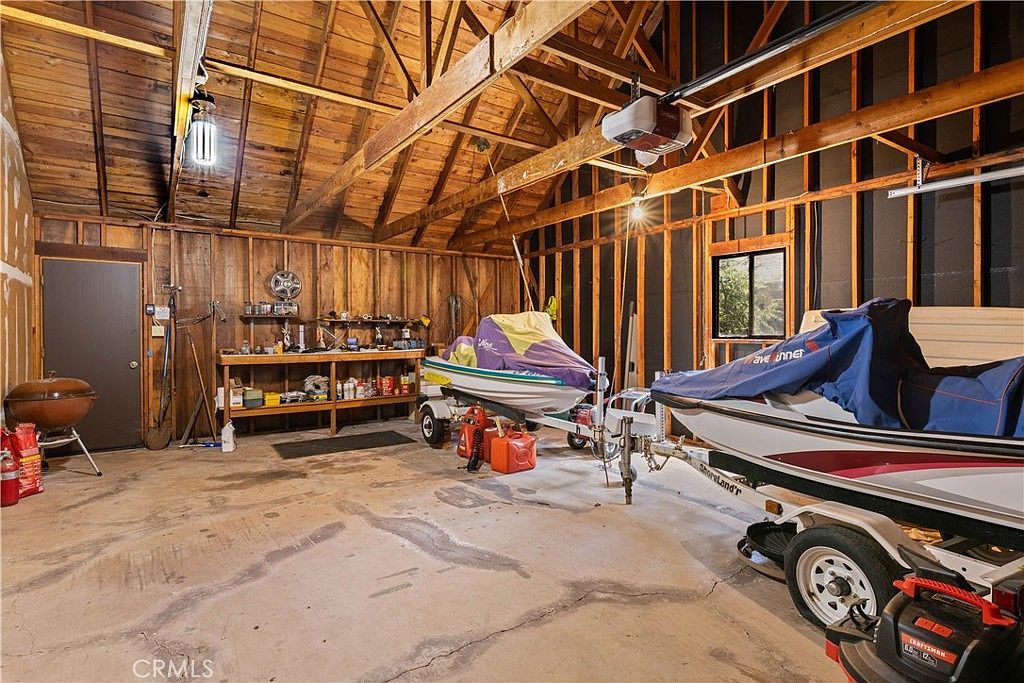 This spacious garage features exposed wood framing and a high vaulted ceiling with visible beams, emphasizing a rugged, utilitarian aesthetic. The concrete floor shows signs of use but remains functional for vehicle and equipment storage. Two covered boats rest on trailers, indicating space for recreational gear. Alongside the far wall, a sturdy wooden workbench holds various tools and small storage containers, highlighting practical organization. A dark-colored door, a window providing natural light, and a few hanging lights complete the utilitarian design, making it a versatile area for storage, project work, or vehicle upkeep.