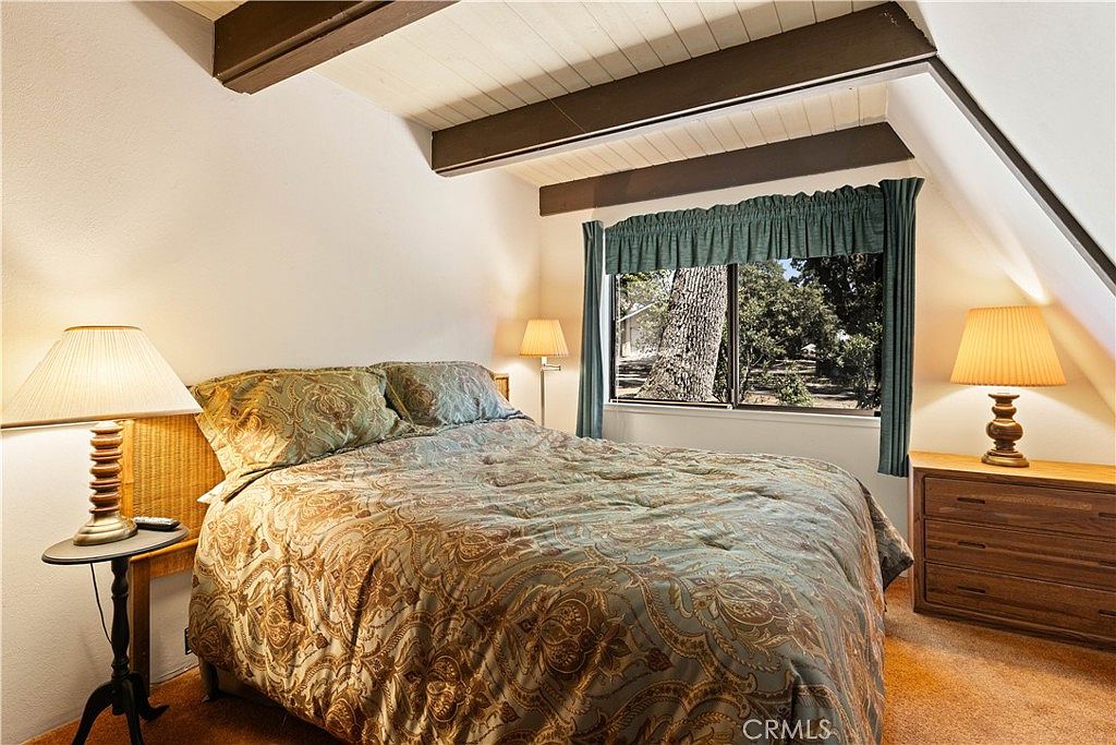 This cozy bedroom is nestled under a sloped ceiling with exposed wooden beams that add architectural interest and warmth. A large window framed by dark green curtains lets in natural light while offering a view of trees outside, connecting the room to nature. The bed features a patterned bedspread in muted earthy tones, complementing the caramel-colored carpet below. Two bedside tables hold matching lamps with textured shades, providing soft, ambient lighting. The dresser on the side maintains the wooden theme, blending seamlessly with the overall vintage-inspired, warm, and inviting atmosphere of the space.