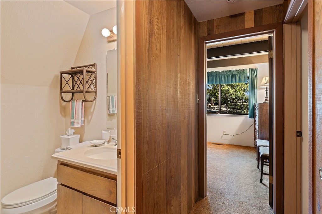 This cozy hallway connects to a small bathroom and an adjacent room. The bathroom features neutral cream walls with a simple white countertop and an oak cabinet below, offering storage space. A wicker-style towel rack mounted above the toilet adds a rustic charm, complemented by a single light fixture over the mirror. Warm wood paneling lines the hallway walls, providing a natural, earthy feel. The carpeting extends throughout the hallway and into the room beyond, which is illuminated by natural light through a window dressed with teal curtains and valance, contributing a splash of color and inviting atmosphere.