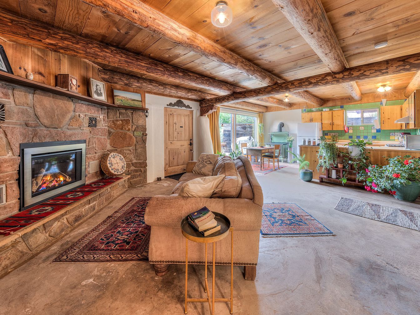 This inviting open-concept living and kitchen space features rustic wooden ceiling beams and a matching wood-paneled ceiling, creating a warm, cabin-like ambiance. A large stone fireplace sets a cozy tone, complemented by earth-toned rugs and a comfortable beige sofa adorned with neutral cushions. The kitchen area is accented with green and yellow tiled backsplash contrasting the natural wood cabinetry, while indoor plants add vibrant greenery throughout. Natural light streams in from a sliding glass door, leading to an outdoor space. The overall aesthetic blends rustic charm with functional comfort, invoking a welcoming, lived-in feeling.