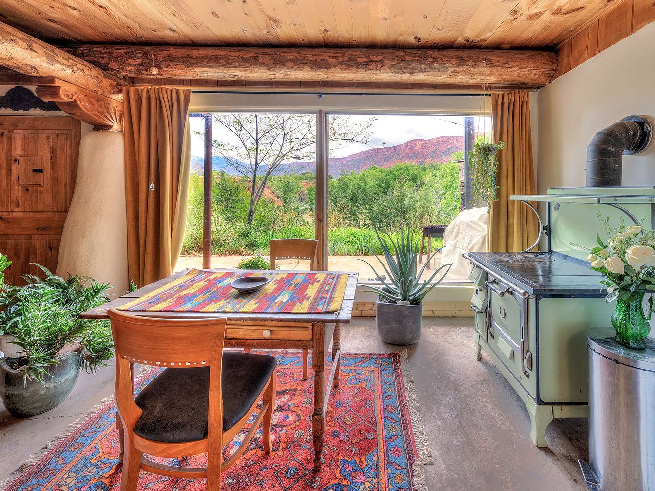 This charming kitchen nook features a rustic, Southwestern style with exposed wooden beams and log ceiling details. A colorful, patterned rug and matching table runner bring warmth and vibrancy, complementing the natural wood tones of the small dining table and chairs. A vintage green stove adds a nostalgic, functional accent. Large sliding glass doors offer sweeping views of lush greenery and red rock mountains, inviting natural light to fill the space. Earthy tones dominate, with terracotta curtains and various potted plants enhancing the cozy, nature-inspired atmosphere.