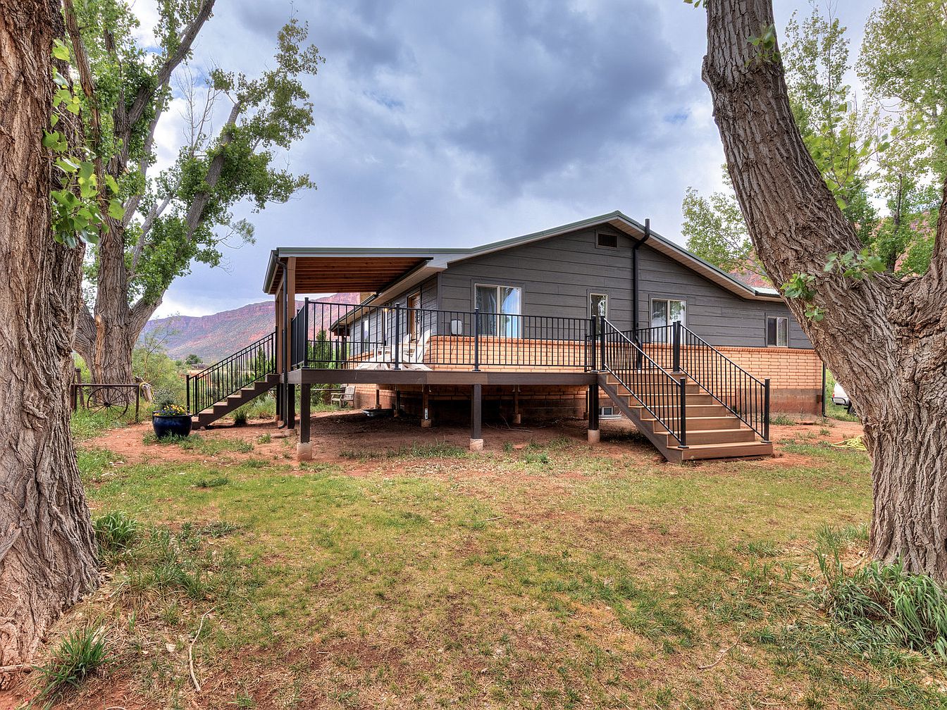 This outdoor space features a raised deck attached to a single-story home with a low-pitched roof and horizontal siding in muted gray tones, complemented by a warm brick foundation. The deck is accessed by two symmetrical staircases on either side, each with simple black metal railings that add minimalist modernity. A covered section offers shade and shelter, creating a versatile spot for seating or dining outdoors. The landscaping highlights natural elements with mature trees framing the grassy yard and rugged earth patches, against the backdrop of distant red-hued hills under a moody sky, blending rustic charm with contemporary comfort.