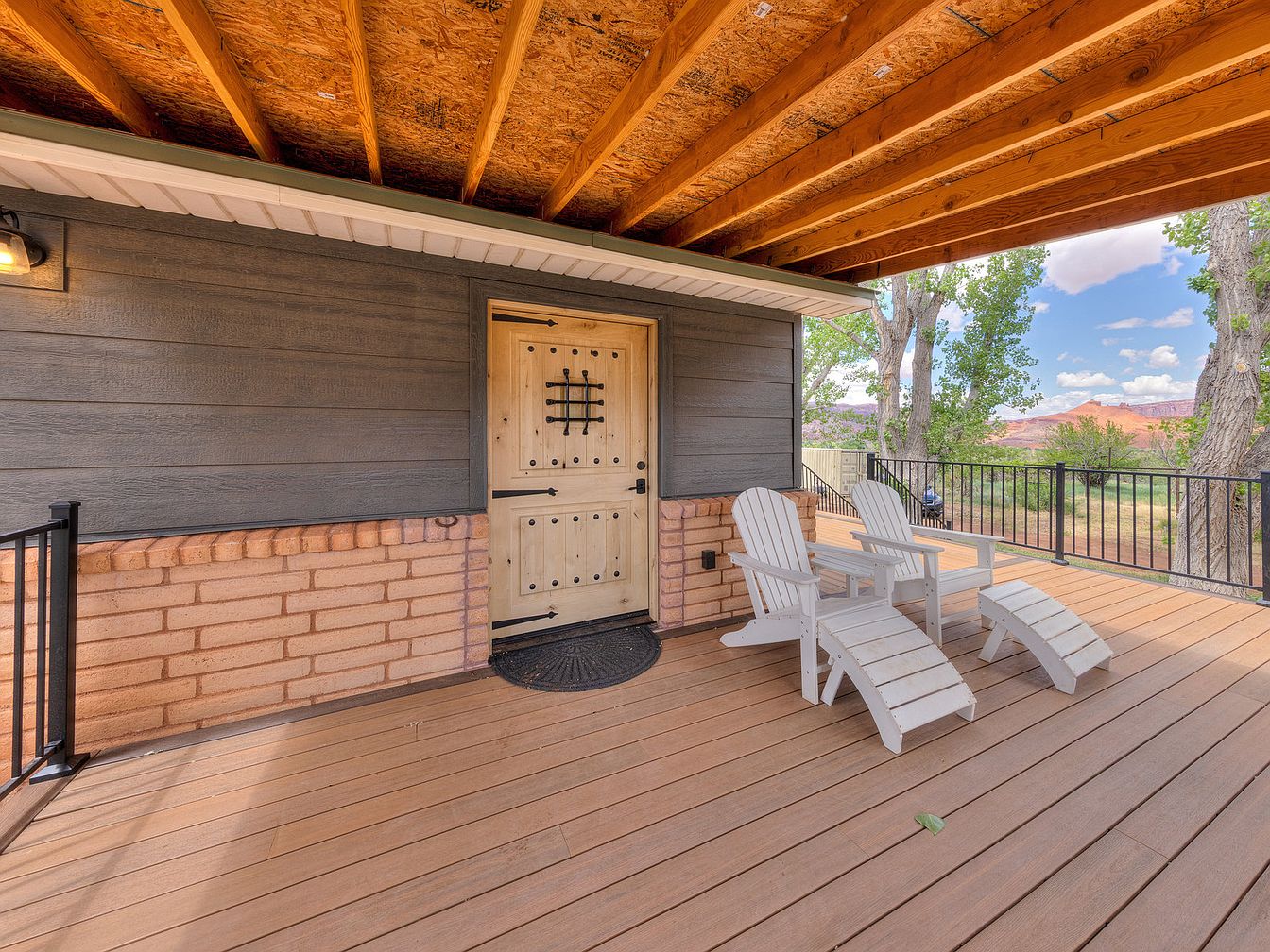 This outdoor covered deck area serves as a welcoming entry into the home, featuring a sturdy wooden door adorned with decorative iron hardware that adds rustic charm. The flooring consists of warm-toned wooden planks complementing the earthy brick half-wall and dark horizontal siding. Exposed wooden beams overhead give a natural, handcrafted feel, blending well with the serene landscape visible beyond the black metal railing. Two white Adirondack chairs with matching footrests invite relaxation while taking in the scenic view of trees and red rock formations under a bright blue sky. The space balances function and inviting, natural aesthetics.