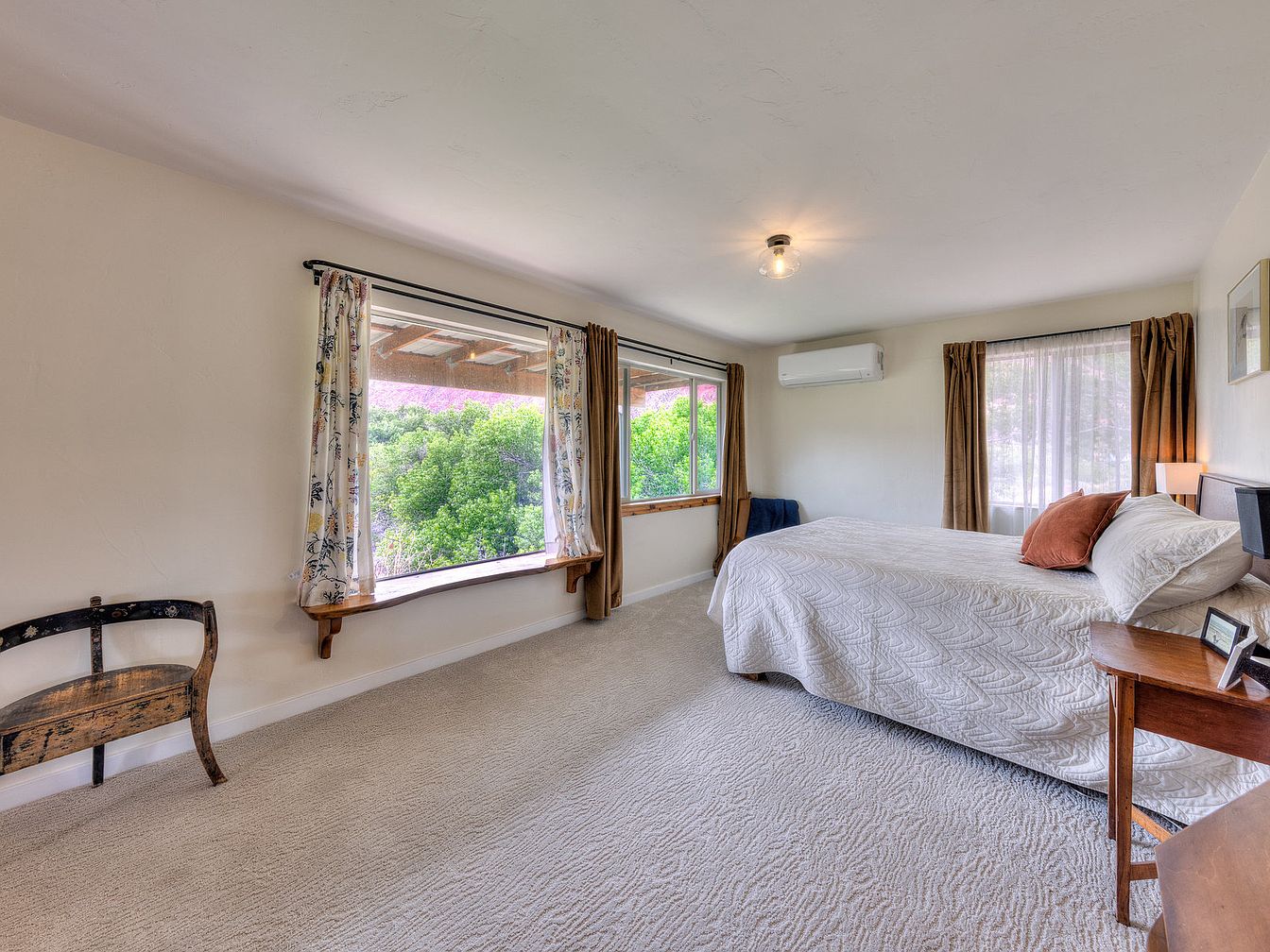 This spacious bedroom features a serene, neutral color palette with soft cream walls and light beige carpeting that adds warmth underfoot. The queen-sized bed is dressed in a white quilted bedspread accented by rust-colored pillows, creating a cozy atmosphere. Natural light fills the room through two sets of large windows, one with a charming built-in wooden bench beneath, adorned with floral and solid brown curtains for layered privacy and style. Rustic wooden furniture pieces, including an antique chair and bedside tables, complement the understated decor. A modern wall-mounted air conditioning unit ensures comfort year-round, while simple ceiling lighting keeps the space bright and inviting.