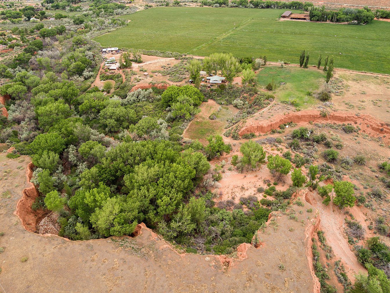 This expansive property features a blend of cultivated fields and natural rugged landscapes, with a prominent green pasture in the background and a dense cluster of mature trees lining the center. The terrain transitions from lush vegetation to dry, sandy soil interspersed with red rock formations, creating a striking contrast. Small structures and paths suggest a rustic homestead nestled within a spacious rural environment. The overall setting highlights the property’s vast outdoor potential, combining agricultural use with natural beauty, emphasizing a serene, country lifestyle surrounded by open space and greenery.