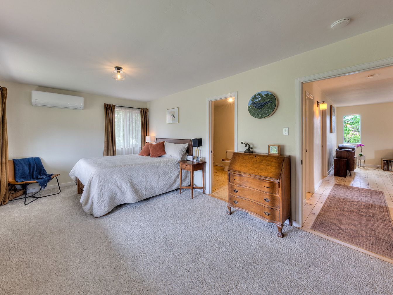 This spacious master bedroom features soft cream-colored walls that enhance the light gray carpeting for a calm and inviting atmosphere. The room includes a large bed with a white quilted bedspread accented by two burnt orange pillows. On either side, wooden nightstands with lamps add functional symmetry. A cozy corner chair draped with a navy throw sits beneath a split air conditioning unit, blending modern comfort with classic elements. To the right, a vintage wooden bureau and a small framed artwork create a warm focal point. A door leads to an en-suite bathroom, while another opens into a light-filled hallway with natural wood flooring and subtle earth-toned rugs, connecting the room to the rest of the home.