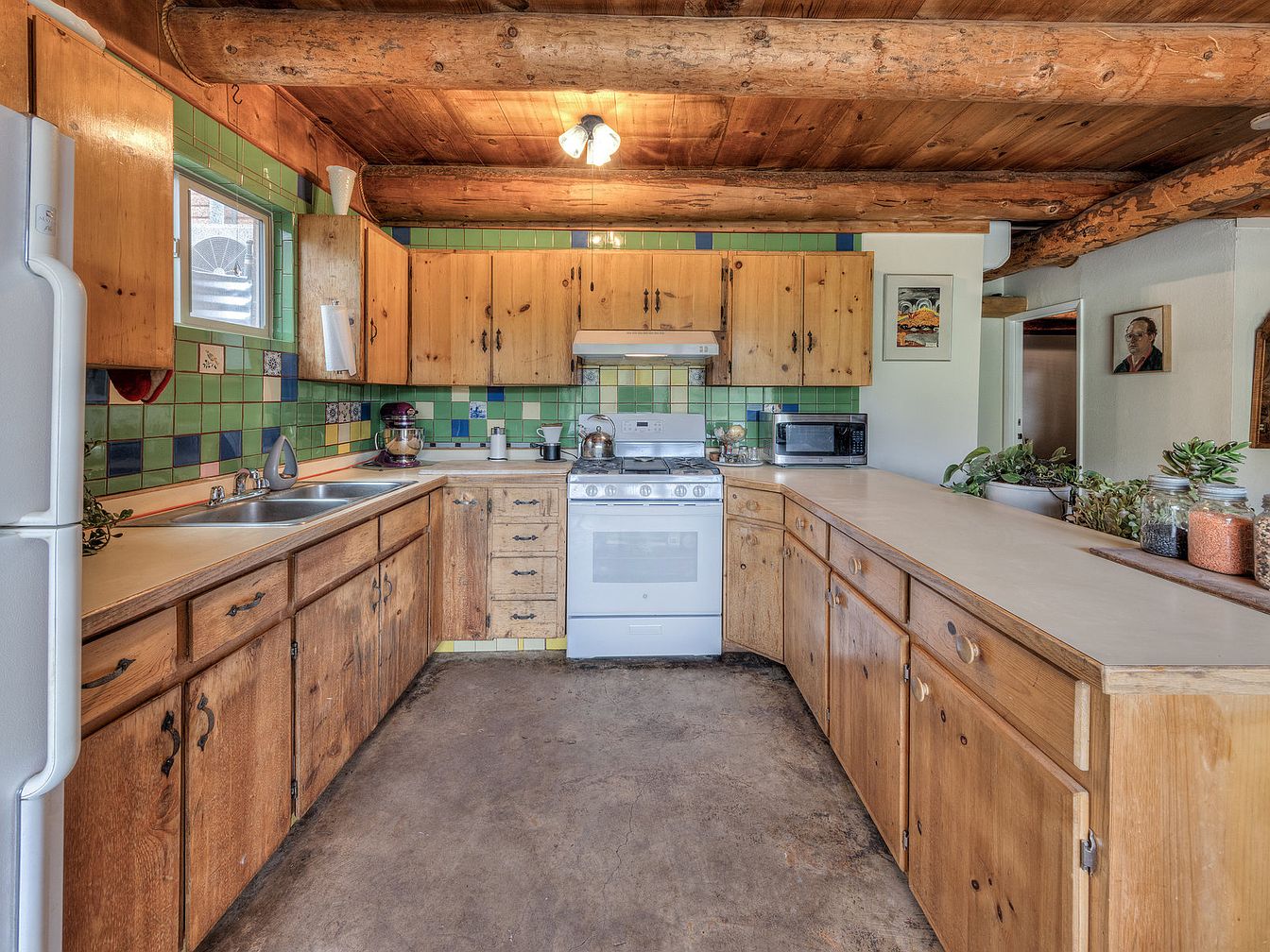 This kitchen features a U-shaped layout with a warm, rustic aesthetic emphasized by exposed wooden ceiling beams and wood-paneled cabinets. The cabinetry exhibits a natural, knotty pine finish with dark iron handles that complement the earthy, textured concrete floor. Above the stove and counters, a colorful tiled backsplash in shades of green and blue adds lively contrast while maintaining a vintage, handcrafted charm. The white appliances, including a stove and refrigerator, provide a clean, functional look. Potted plants and small decor items add subtle touches of greenery and personal style, enhancing the cozy, inviting atmosphere.