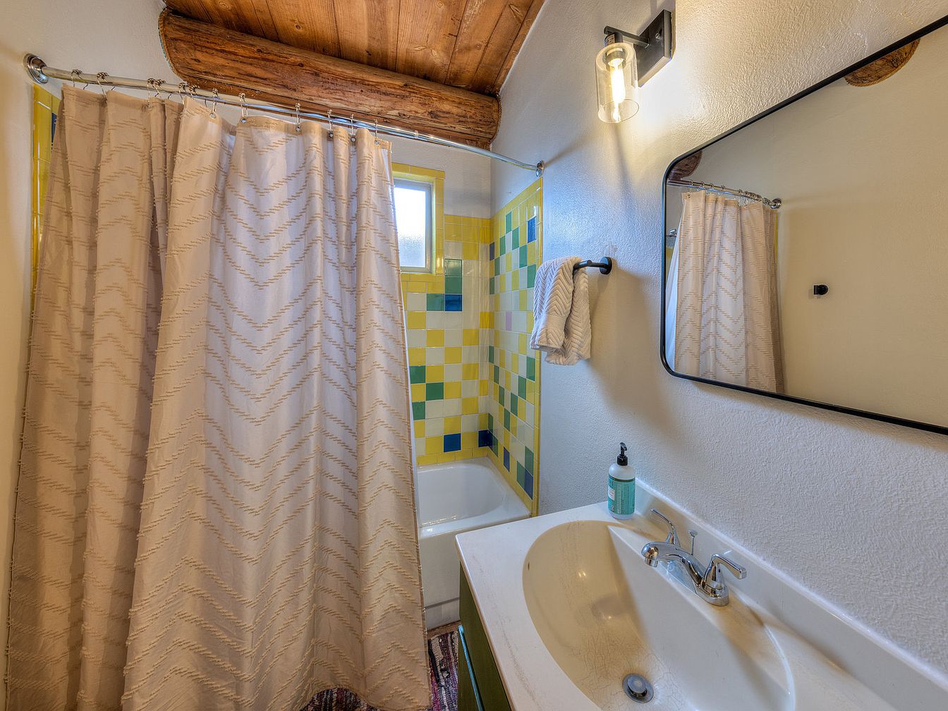 This cozy bathroom features a compact shower-tub combination with vibrant, multi-colored tiles in shades of yellow, green, and blue, creating a lively focal point. Natural light filters through a small frosted window above the tub, enhancing the cheerful ambiance. The ceiling maintains rustic charm with exposed wooden beams and planks, contrasting the clean white walls. A curved shower curtain rod holds a beige curtain with subtle chevron patterns, complementing the muted tones. The white vanity includes a built-in sink and a modern chrome faucet. A black-framed rectangular mirror and minimalistic light fixture complete the simple, functional space.